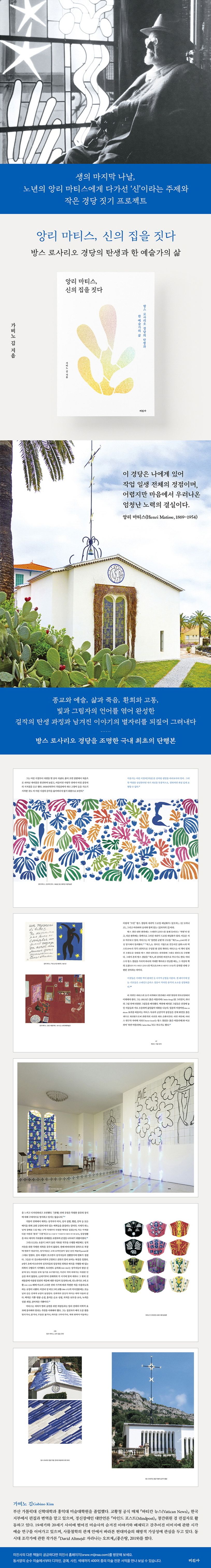 생의 마지막 나날, 노년의 앙리 마티스(Henri Matisse, 1869-1954)가 완성해낸 역작이자 그 예술의 정수인 방스 로사리오 경당을 중심으로 한 예술가의 세계와 그의 시대, 근현대 미술에서 종교의 의미를 돌아보도록 안내한다. 1941년 대수술 후 생사의 고비를 넘기고 ‘부활한’ 마티스는 1947년 말, 프랑스 남부 방스에 위치한 도미니코 수도회의 로사리오 경당 설계라는 운명을 받아들인다. 그는 종교와 예술, 삶과 죽음, 환희와 고통, 빛과 그림자의 언어를 종합해 경당 안팎을 손수 완성해냈다. 이 책에서는 방스 로사리오 경당 축조의 과정을 찬찬히 들여다보면서 각 작업의 의미를 마티스의 전 예술과 종교의 맥락에서 재조명한다. 이를 위해 그의 작품들뿐 아니라 지난 발언들을 불러내어 그 의미를 짚어보고, 경당 축조에 관여했던 다양한 인물들의 입장과 영향 관계를 설명한다. 마티스의 개인 간호사로 고용되었던 모니크 부르주아가 후에 자크-마리 수녀가 되어 마티스와 로사리오 경당 프로젝트를 이어주기까지의 사연, 성미술 운동 등 당대 종교 미술의 현실, 후대 미술가들의 응답을 비롯해 20세기 이후 미술계와 마티스를 둘러싼 세계의 지도를 그려보고 ‘신’이라는 주제와 마주앉은 노화가와 대화할 수 있다. 방스 로사리오 경당을 다룬 국내 최초의 단행본으로, 앙리 마티스를 한국 저자의 글로 만나볼 수 있는 기회이다.