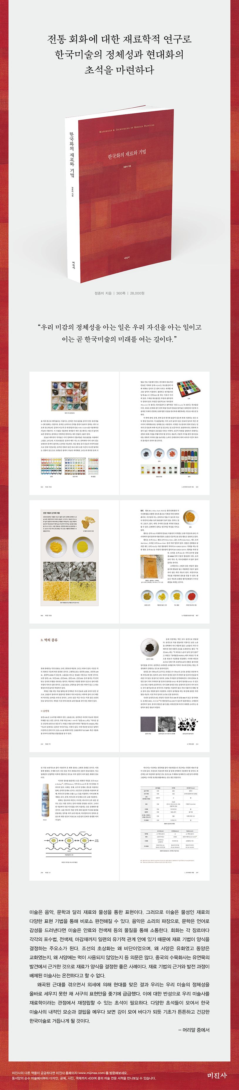 저자는 우리 미감의 정체성을 아는 일이 “우리 자신을 아는 일”이며 이는 곧 “한국미술의 미래를 여는 길”이라고 말한다. 아울러 동·서양화나 채색·수묵 사이에 있는 논란과 갈등은 “재료학”을 통해 극복될 때 비로소 “회화라는 통합적 차원으로 나아갈 수 있”다고 말한다. 한국미술에 대한 저자의 웅숭깊은 시각은 다채로운 회화의 세계로 우리를 초대한다. 한국화에 관심이 있거나 재료학에 대한 기초 개념을 정립하고 싶은 일반 독자와 연구자, 한국미술의 전통적 미감과 정서를 입체적으로 경험해보고 싶은 이들에게 도움이 될 책이다.