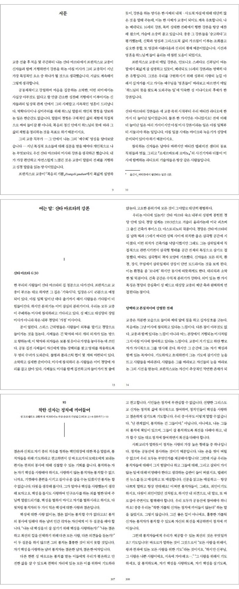 프란치스코 교황은 이 강론에서 소망의 씨를 뿌리며 우리가 나아갈 길을 제시한다. 하지만 이를 그저 달콤한 말들로 듣지 않도록 주의하자. 교황의 강론은 때로는 단호한 어조이고 때로는 구체적 경고를 담고 있다. 무엇보다 우리를 일상의 투쟁 속으로 인도한다. 선명한 표상, 단순한 언어, 명료한 주제, 구체적 제안을 통해 복음의 핵심에 다다르는 교황의 강론은 진리의 단순한 ‘전달’을 넘어선 것이다. ‘프란치스코’의 강론은 하느님과 그분 백성의 대화요 만남이다.