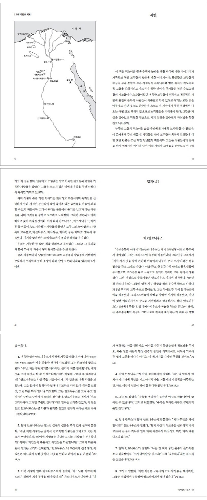 사막 교부란 주로 이집트 북부 켈리아와 스케티스 사막에서 생활했던 영적 사부 또는 원로들을 의미한다. 우리는 흔히 ‘모범적인 가르침을 남긴 고대 그리스도교 저술가’들을 교부라고 부르지만, 사막 교부들 대다수는 이에 부합하지 않는다. 사막의 많은 은수자들이 저술과 독서보다는 손노동과 수행을 중시했다. 그들은 ‘책’이 아니라 ‘삶’을 대면하고자 사막으로 갔으며, 그곳에서 모든 것을 걸고 치열하게 살았다.