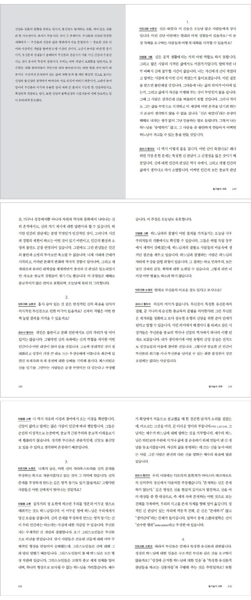 신은 죽었다는 니체의 진단과 신을 일깨우는 바오로의 연설, 두 극단 사이에서 펼쳐지는 이 책은 신앙과 불신앙의 동기와 태도를 진지하게 따져 묻는다. 신앙과 불신앙은 단어와 문장과 판에 박힌 문구로 만들어진 어떤 고안물이 아니다. 중요한 것은 삶의 지향, 즉 신뢰와 실존적 책임이다. 이것들은 신과 함께하든, 신이 없든, 신 안에 있든 중요하다. 이것들은 끊임없이 중요하며, 신을 떠났어도 중요하다.