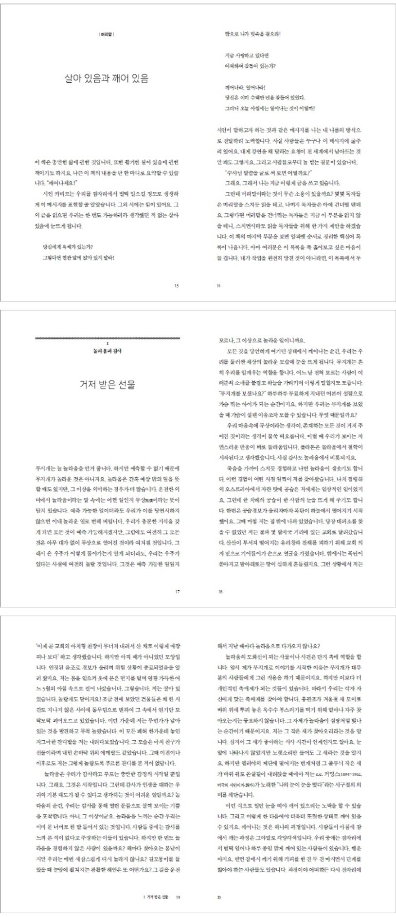 감사를 통해 우리의 평범한 일상이 눈부시고 충만하게 채워질 수 있음을 일러 주는 책이다. 베네딕도회 수도승인 저자는 감사로 충만한 삶을 향한 여정의 이정표와도 같은 ‘기도’, ‘관상’, ‘믿음’, ‘희망’, ‘사랑’과 같은 개념들을 동원하여, 우리가 일상에서 감사를 누리고 실천하는 방법을 저자 특유의 따뜻한 해석으로 차근차근 짚어 준다.