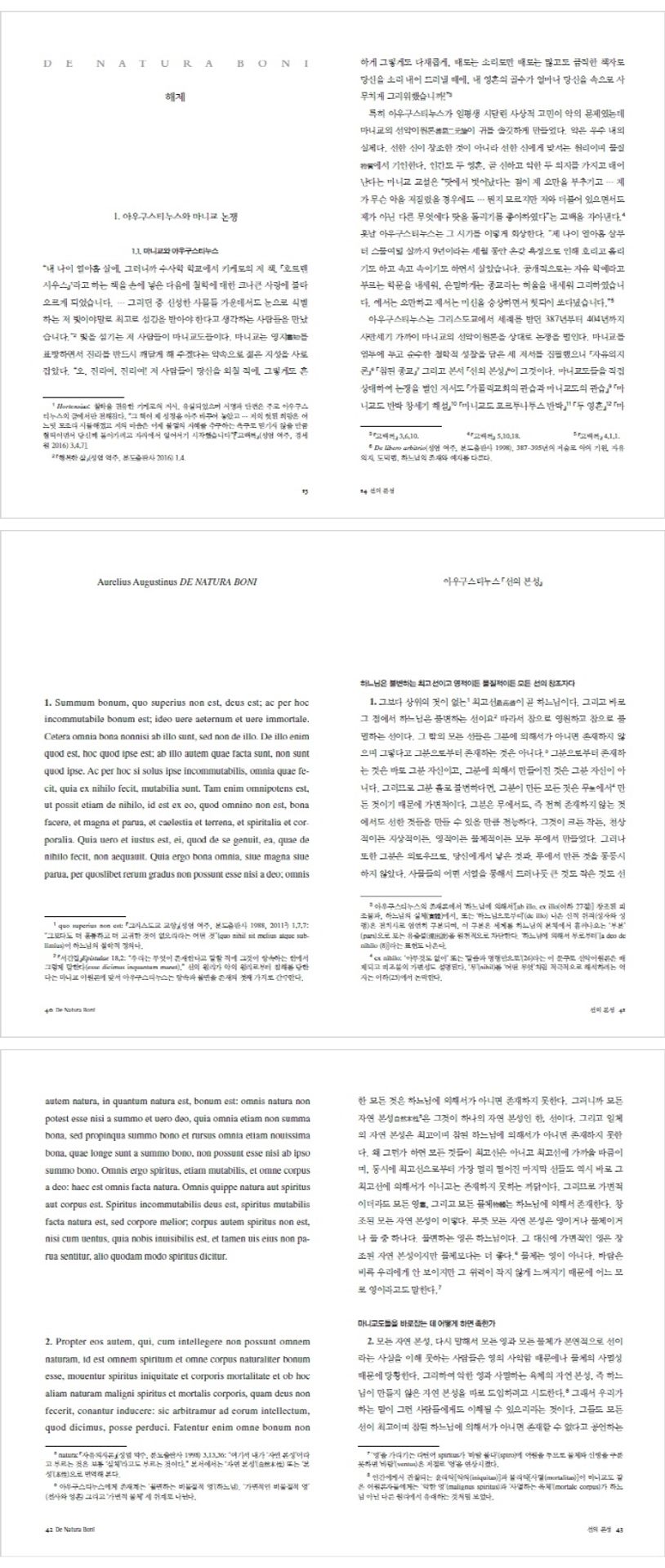 아우구스티누스가 평생 숙고했던 사상적 고민 중 하나는 악의 문제였다. 마니교 교설에 따르면, 우주 내의 실체인 악은 물질에서 기인하며 선한 신에게 맞서는 원리이다. 그리고 인간도 선한 의지와 악한 의지라는 두 영혼을 가지고 태어난다고 본다. 젊은 아우구스티누스는 이러한 선악이원론에 매력을 느꼈고 열아홉 살부터 스물여덟 살까지 9년 동안 마니교에 머물러 있었다. 그러다 회심 이후 그리스도교에서 세례를 받고 25년 가까이 마니교의 선악이원론을 상대로 논쟁을 벌인다. 마니교 논쟁 마지막 무렵에 나온 ?선의 본성?은 아우구스티누스의 저술 중 가장 분량이 적은 편에 속한다. 그러나 학술적 논리와 성서적 반증과 수사학적 웅변 등을 다채롭게 펼치면서 예리하고 격렬하게 마니교를 반박하는 모습을 보여 준다.
