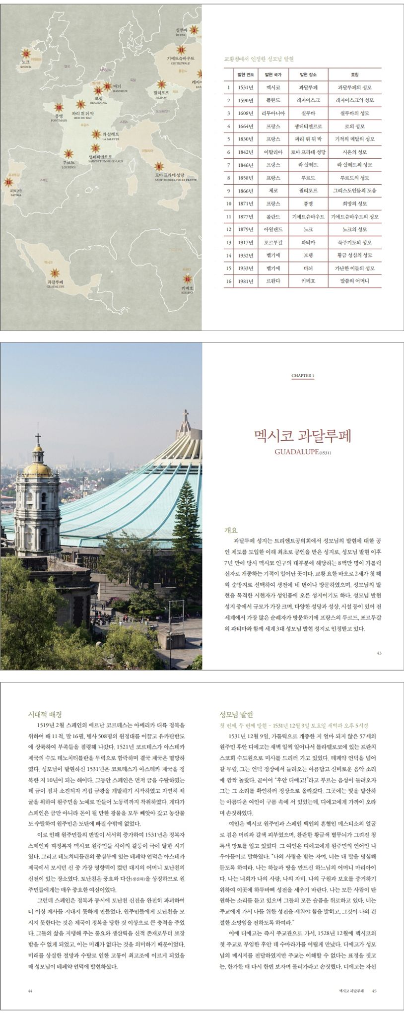 교황청에서 인정한 16곳의 성모 발현 성지를 직접 순례하고 만든 안내서이다. 멕시코 과달루페, 프랑스 루르드, 포르투갈 파티마처럼 이미 널리 알려져 있는 성지만 아니라, 리투아니아 실루바, 체코 필리포프, 아일랜드 노크, 벨기에 바뇌, 르완다 키베호처럼 조금은 덜 알려진 성지까지 상세하게 소개한다.
