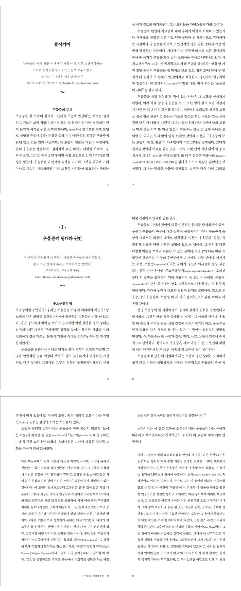 ‘우울증’(depression)이라는 말에는 평평한 길 위의 ‘움푹 팬 곳’(depression)이라는 의미가 담겨 있다. 그러나 이로써 이 고통의 실체를 충분히 설명하지는 못할 것이다. 우울증은 단지 움푹 팬 정도가 아니라, 헤어나기 힘들 만큼 깊디깊은 구렁과 같다. 우울증은 정신적, 신체적 고통은 물론이고, 영적 고통까지 일으키는 심각한 질병으로, 대개 다면적인 특성을 띤다.
