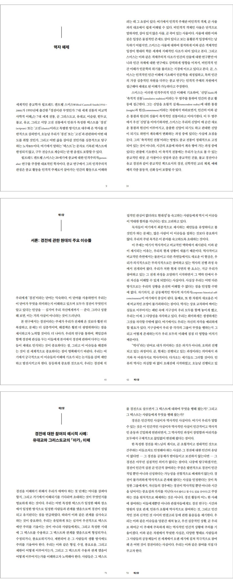 「경전이란 무엇인가」는 세계적인 종교학자 윌프레드 캔트웰 스미스의 대표적인 저작이다. 세계 7대 전통(유대교, 그리스도교, 이슬람, 힌두교, 불교, 동서양 고전 전통)을 비교역사학적으로 탐구하면서 ‘경전’의 의미를 궁구하는 이 책은 철저하고 방대한 연구를 통해 어떤 텍스트가 성스럽다고 여겨지는 차원에서 인간의 삶에 어떻게 스며들어 왔는가를 묻는다. 그리고 세계의 주요 종교 전통들이 경전을 활용해 온 역사를 검토하면서 경전이 인간사에서 막중하고 때로는 가공할 힘을 발휘해 온 과정을 밝힌다. 저자는 이 과정을 전개하면서 어떤 텍스트를 성스럽게 여기거나 이웃의 경전을 보배롭게 여긴다는 것이 무엇을 뜻하는지, 그리고 문화적 곤경에 처해 있는 우리 시대에 인간이 된다는 것이 무엇을 뜻하는가에 관해서 중요한 통찰을 준다.