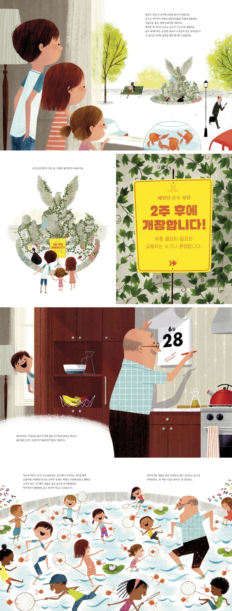 헨리, 꼬마 올리, 아기 에밀리 삼 남매는 커다란 도시의 작은 집에서 할아버지와 함께 살아요. 이곳 거실에 놓인 작은 어항 안에는 왕눈이, 뽀글이, 살랑이 금붕어 3마리가 살고 있고요. 친구들은 모두 여행을 떠났고, 도시와 어항 속 여름은 갈 곳 없이 지루하고 더워요. 그러던 어느 날, 낡고 오래된 분수대 앞에 이상한 표지판이 등장했어요. “해밀턴 분수 정원 2주 후에 개장합니다. 여름 별장이 필요한 금붕어는 누구나 환영합니다.” 방치되어 쓸쓸했던 분수대에는 깨끗한 물과 식물이 새로 채워지고, 아이들의 마음은 설렘으로 가득 차요. 손꼽아 기다리던 날, 삼 남매와 할아버지는 금붕어들을 데리고 분수 앞으로 가요. 분수 앞에는 수많은 아이들과 금붕어들이 와 있었어요! 도시에 남은 아이들과 금붕어들은 어떤 여름을 보내게 될까요? 90년대 뉴욕에서 있었던 실화를 다룬 이 그림책에서, 동화보다 더 동화 같은 사랑스러운 여름을 만끽하기를요.
