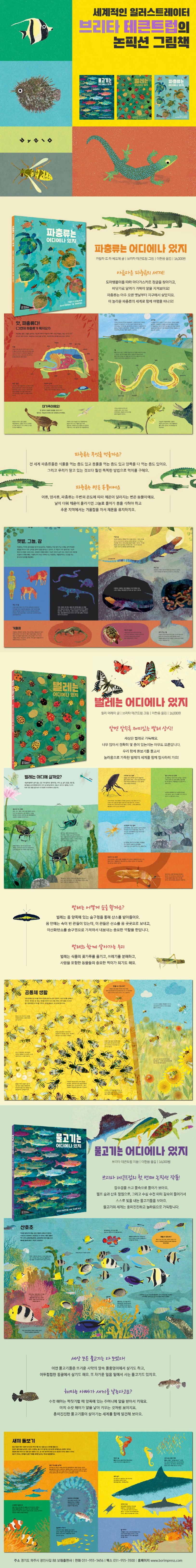 누구나 좋아하는 가장 유명한 파충류는 공룡이지요. 해마다 50종의 새로운 공룡 화석이 발견되고 있고 공룡 열풍은 세계적으로 계속되고 있어요. 사막거북, 아시아숲거북처럼 우리에게 생소한 이름의 거북도 파충류이지요. 악어는 악어과의 커다란 파충류이고 25종이나 되어요. 비슷비슷해 보이지만, 크로커다일, 앨리게이터, 카이만, 가비알 등 다양한 종류가 있어요. 날쌔게 움직이는 도마뱀도, 배 쪽의 비늘을 세워서 몸을 좌우로 S자로 물결치듯 나아가는 뱀도 파충류이지요. 온도에 따라 색이 변하는 것으로 유명한 카멜레온도 파충류예요. 《파충류는 어디에나 있지》에서는 다양한 파충류의 특징과 종류를 알기 쉽게 정리해서 아름다운 그림으로 보여 주지요.