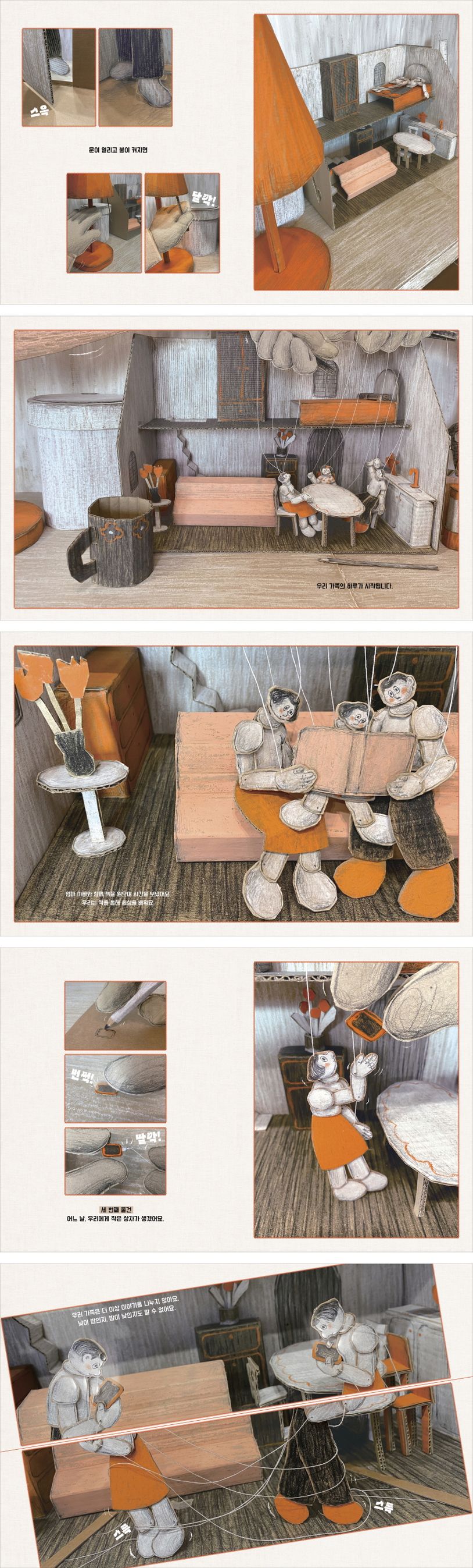 작가는 이 모든 작업을 손으로 그리고 칠하고 오리고 붙여 입체로 만든 후, 휴대폰으로 촬영한 사진으로 페이지를 만들었습니다. 책 속에서 실과 연결된 인형은 마리오네트에서 영감을 얻었지요. 책 속 이야기에서 실로 움직이는 인형들은, 스마트폰과 각종 미디어를 중심으로 삶이 흐르는 우리들의 모습과 무척 닮았습니다. 아이는 스마트폰이 없고, 어른들만 가지고 있는 것도 재미난 고증입니다. 식당에 가도, 카페에 가도 테이블마다 사람과 그 수에 맞춘 스마트폰, 태블릿들이 자리하고 있는 요즘입니다. 저녁을 먹거나 차를 마시는 동안 대화를 하거나 눈을 맞추는 대신 각자의 화면을 보기도 하지요. 책을 보며 왠지 뜨끔한 마음이 든다면 오늘은 화면이 아니라 사랑하는 가족의 눈을 보며 시간을 보내 보면 어떨까요?