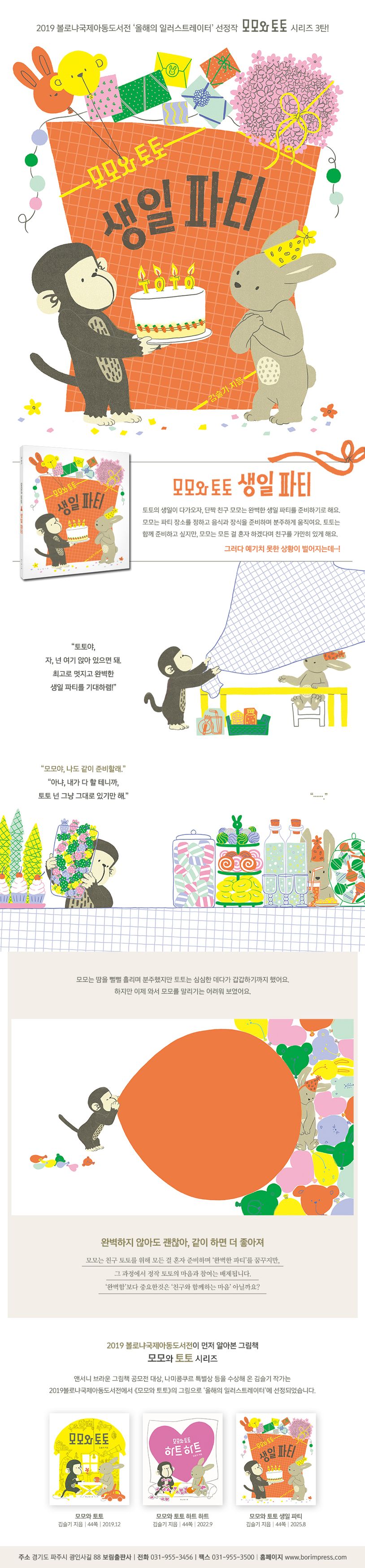 토토의 생일이 다가오자, 단짝 친구 모모는 완벽한 생일 파티를 준비하기로 해요. 모모는 파티 장소를 정하고 음식과 장식을 준비하며 분주하게 움직여요. 토토는 함께 준비하고 싶지만, 모모는 모든 걸 혼자 하겠다며 친구를 가만히 있게 해요. 파티가 시작되고 친구들이 모여들지만, 자리는 모자라고 케이크를 둘 공간조차 없어요. 결정적으로, 초를 끄는 일도 모모가 하려 하자 토토가 소리치고, 그 순간 벌이 나타나 모두가 도망치며 달리기해요. 달리는 사이 모두가 즐거워졌고, 토토는 망가진 케이크를 보며 "완벽하다"라고 말해요. 결국 친구들과 함께 케이크를 다시 만들고, 진짜 생일 축하를 나누며 모두가 진심으로 행복한 순간을 함께해요. 모모와 토토는 서로를 진정으로 아끼는 최고의 친구랍니다.