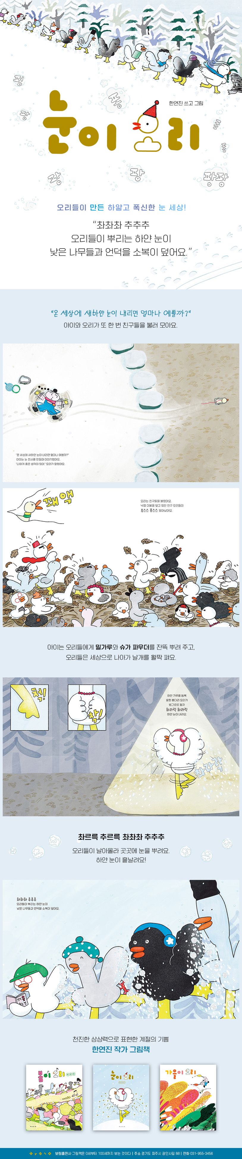 《가을이 오리》와 《봄이 오리》에 이어 한연진 작가의 세 번째 오리 이야기가 이번 겨울 찾아옵니다. 전작과 마찬가지로 《눈이 오리》도 다양하고 재미난 의성어, 의태어가 사용되며 신나고 경쾌한 감상을 전합니다. 책을 읽을 때 노래하는 듯한 기분을 느낄 수 있습니다. 또한 아이의 작은 상상이 온 세상을 변화시키고, 이 과정에서 돋보이는 오리들과의 우정과 협동이 우리 주변을 살펴보게 합니다.