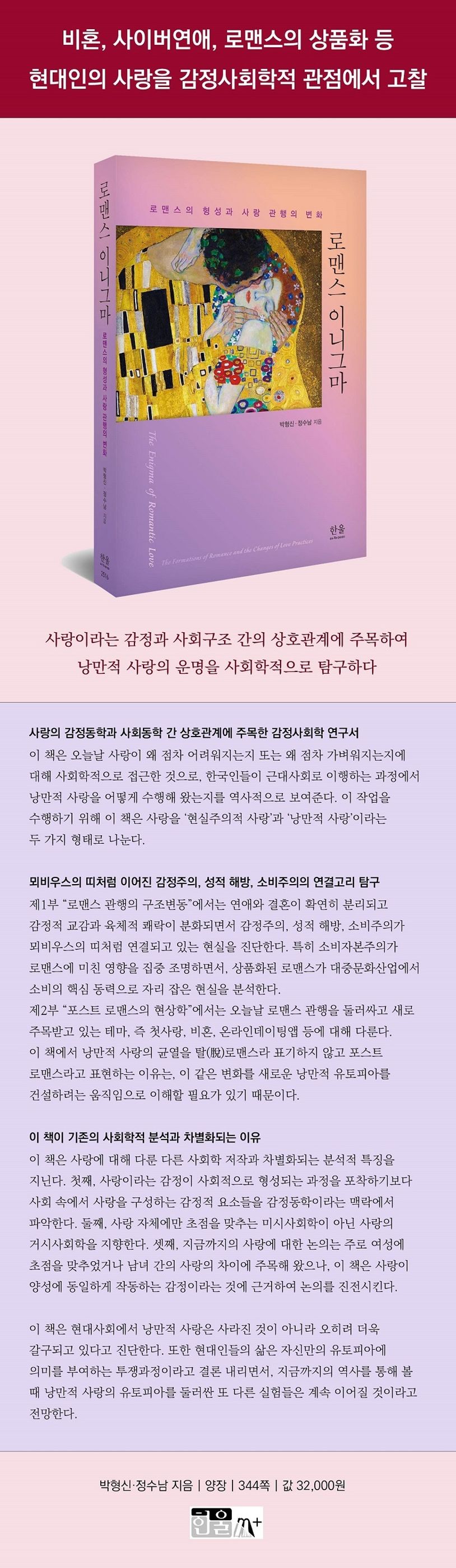 사랑에 대한 기존의 사회학적 연구는 사랑의 사회동학을 검토하는 것이었다. 다시 말해 사랑이라는 감정을 단순히 감정이 아니라 하나의 사회적 현상으로 포착해 내고자 했다. 필자들 역시 감정이 사회적 현상이라는 점을 부인하지 않는다. 하지만 사랑이 감정이 아니라고 할 수는 없다. 그리고 사랑이 사회적 현상인 이유 중 하나는 사랑이 하나의 단일 감정이 아닌 사회적 영향을 받는 복합 감정이기 때문이다. 따라서 사랑에 대한 사회학적 연구는 사랑이라는 복합 감정이 어떻게 사회동학과 관련하여 출현하고 표출되며, 사랑을 틀 짓는지를 연구할 필요가 있다. 이 책이 주목하는 것이 바로 이것, 즉 사랑의 감정동학이다.
