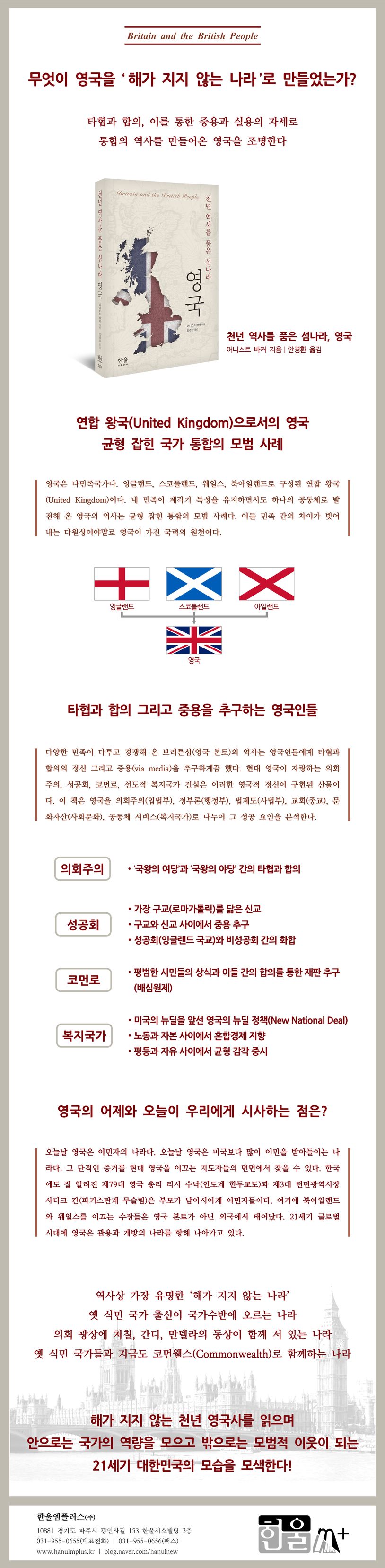 이 책은 영국을 의회주의(입법부), 정부론(행정부), 법제도(사법부), 교회(종교), 문화자산(사회문화), 공동체 서비스(복지국가)로 나누어 성공 요인을 분석한다. 영국의 저명한 정치학자가 자국에 대해 솔직하게 (때로는 자랑스럽게) 쓴 내용이 돋보인다. 1942년에 나온 초판을 옮긴 것으로 오늘날 독자를 위해 여러 상세한 각주를 부기했다. 옮긴이는 인권 친화적인 법학자로 널리 알려진 안경환 서울대학교 명예교수다.