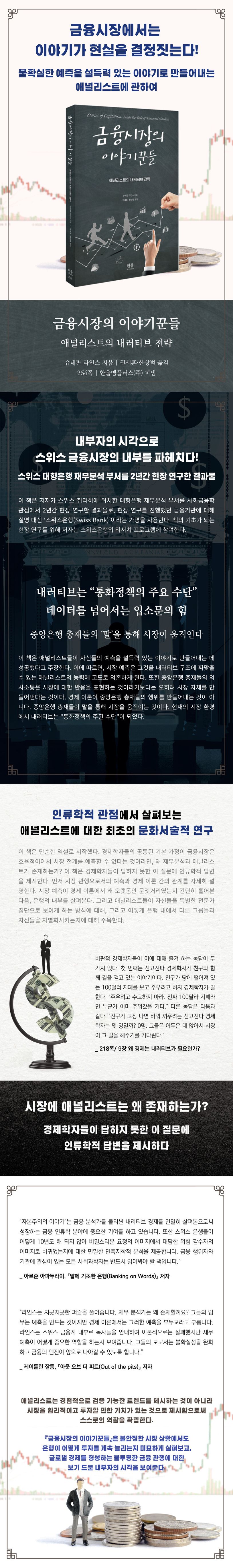 저자는 자본주의 금융시장에서 이러한 미래 예측 이야기를 생산하고 유통하는 데 가장 주도적인 시장 참여자로 재무분석가, 즉 애널리스트에 주목한다. 애널리스트는 주로 대형 금융회사에 소속되어 기업이나 국가가 발행하는 증권을 비롯해 가격평가 대상이 되는 그 어떤 것이라도 분석하는 일을 담당한다. 가치평가 대상에 관한 이야기를 만들어 유통시키는 역할로 인해 애널리스트는 어느 정도는 금융시장을 지배하는 셈이 된다. 이 책은 저자가 금융이 발달된 자신의 고향 스위스 취리히에 위치한 대형은행 재무분석 부서를 사회금융학 관점에서 현장 연구한 결과물이다. 독자들은 이 책을 통해 애널리스트라는 직업 및 관련된 다양한 배경 지식에 대해 흥미롭고도 자세한 설명을 들을 수 있을 것이다.