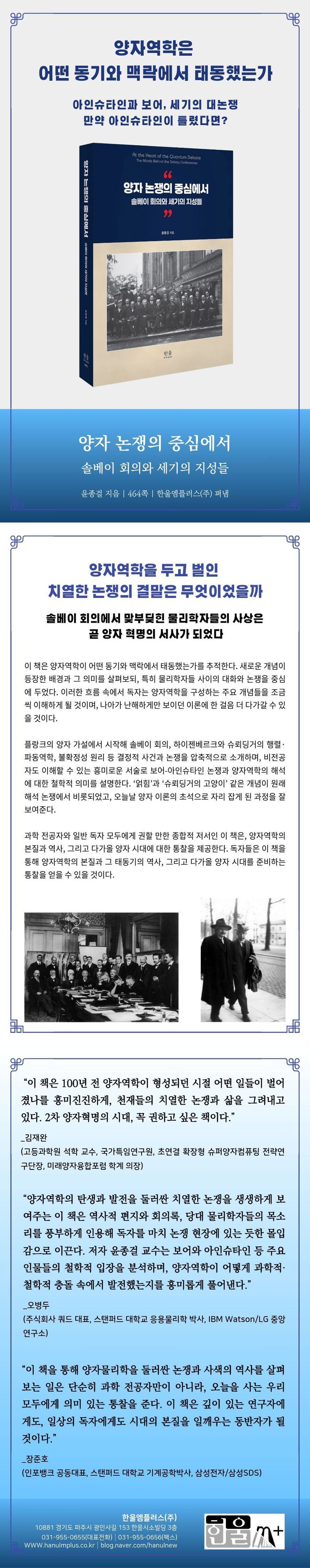 이 책은 ‘솔베이 물리학 회의’를 중심으로, 양자역학이 태동하고 발전해 온 여정을 치밀하게 복원한 지식교양서다. 1911년 제1차 회의부터 1939년 제8차 회의까지, 아인슈타인, 보어, 플랑크, 하이젠베르크, 슈뢰딩거, 디랙 등 당대 최고의 천재들이 한자리에 모여 벌였던 치열한 논쟁을 생생히 그려내며, 그들의 사유가 어떻게 현대 물리학과 양자정보과학의 기초를 다졌는지 탐구한다.