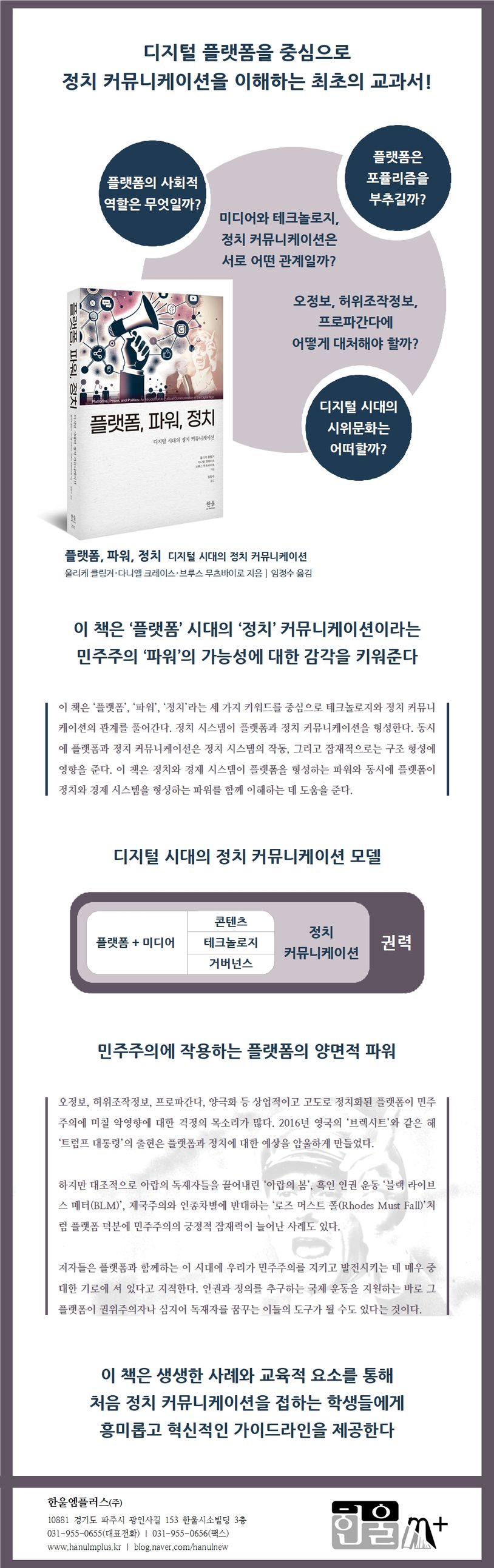이책은독자들에게‘플랫폼’시대의‘정치’커뮤니케이션이라는민주주의‘파워’의가능성에대한감각을키워준다.