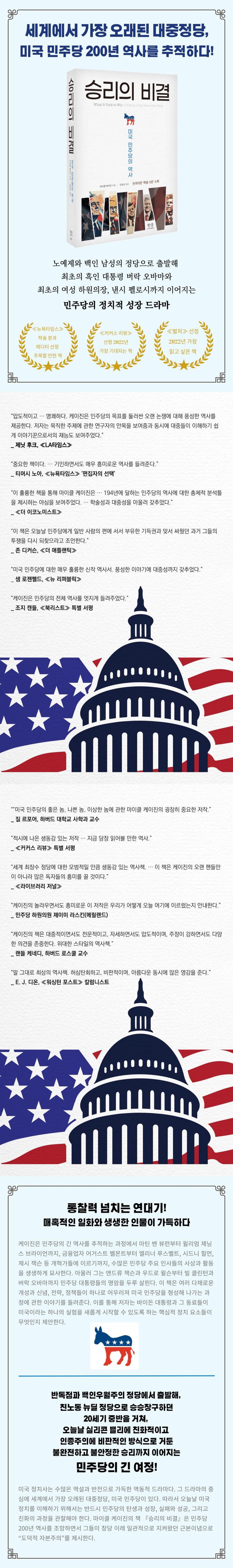 미국 정치사는 수많은 역설과 반전으로 가득한 역동적 드라마다. 그 드라마의 중심에 세계에서 가장 오래된 대중정당, 미국 민주당이 있다. 따라서 오늘날 미국 정치를 이해하기 위해서는 반드시 민주당의 탄생과 성장, 실패와 성공, 그리고 진화의 과정을 관찰해야 한다. 마이클 케이진의 책 『승리의 비결』은 민주당 200년 역사를 조망하면서 그들이 창당 이래 일관적으로 지켜왔던 근본이념으로 “도덕적 자본주의”를 제시한다.