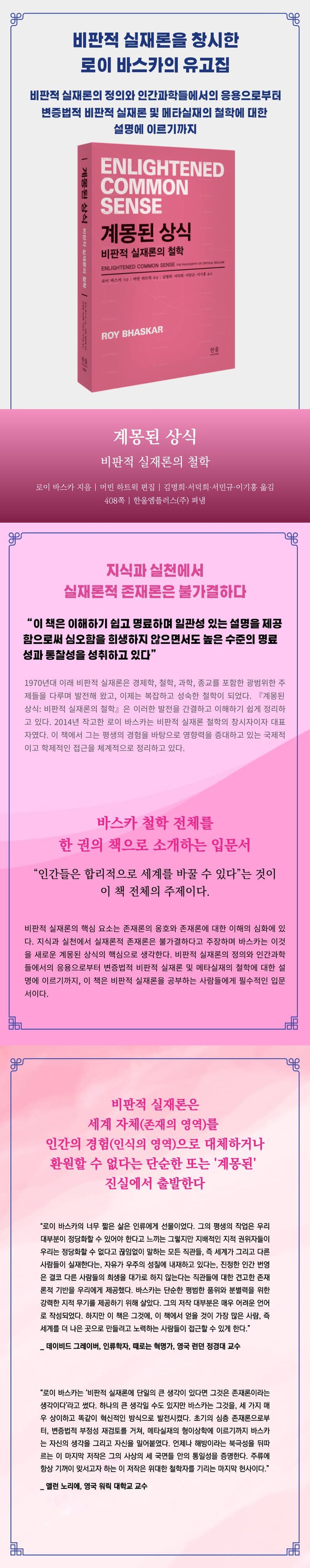 1970년대 이래 비판적 실재론은 경제학, 철학, 과학, 종교를 포함한 광범위한 주제들을 다루며 발전해 왔고, 이제는 복잡하고 성숙한 철학이 되었다. 『계몽된 상식: 비판적 실재론의 철학』은 이러한 발전을 간결하고 이해하기 쉽게 정리하고 있다. 2014년 작고한 로이 바스카는 비판적 실재론 철학의 창시자이자 대표자였다. 이 책에서 그는 평생의 경험을 바탕으로 영향력을 증대하고 있는 국제적이고 학제적인 접근을 체계적으로 정리하고 있다.