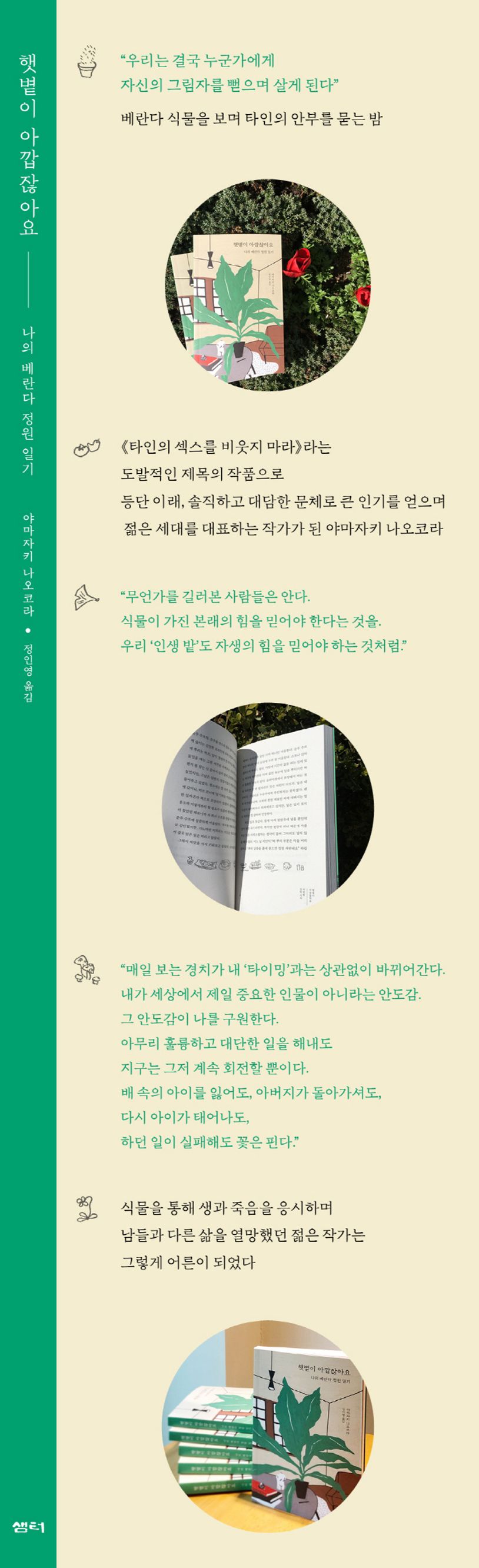 이 책은 힘들었던 시간을 좁은 베란다에서 화분 하나로 시작한 작은 정원(나오 가든)과 농장(나오 팜)을 가꾸며 치유하는 과정을 담고 있다. 식물을 기르며 그녀의 마음도 한 뼘씩 성장했다. 조급하고 초조한 일상에 서늘한 바람을 쐬고, 그늘진 마음에 따뜻한 볕을 쬐었다. 베란다 정원에서 드래곤프루트, 나팔꽃, 장미 등 다양한 식물을 기르며 갖가지 감정들을 통과한다. 생명 하나가 자신의 손끝에서 시작되는 설렘과 책임감, 하나의 식물에 주어진 공간처럼 누구에게나 마땅히 주어져야 할 ‘장소’에 대해, 어느 날 태풍이 들이닥쳐 자신의 삶을 쓸어 가도 그 무력감 앞에 절망하지 않는 의연함, 혹은 태평함. 솔직하고 대담한 그녀의 소설만큼이나 나오코라 작가의 신선한 통찰력이 곳곳에서 빛난다. 또한 식물의 성장과 함께 자연의 흐름과 섭리에 맞춰 살아간다는 것의 의미, 작가로서 느끼는 사명감 등 삶과 자신을 둘러싼 세계에 대한 작지만 소중한 깨달음을 얻으며 자신의 성장을 기록해나간다. 이 책을 통해 작가는 그동안 작가로서 삶의 굴레가 되었던 ‘남들과 달라야 한다’, ‘특별해야 한다’는 강박관념에서 벗어나, 자연의 일부로 그리고 한 사회의 구성원으로서 주어진 역할과 자리에 대해 고민하며 성장해가는 모습을 진진하고도 담백한 필체로 그려낸다.