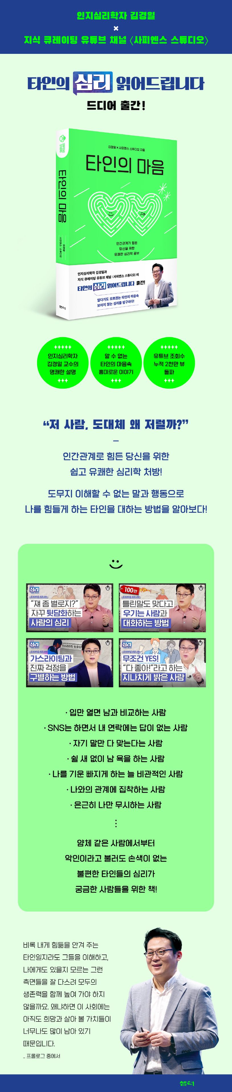 인간의 심리를 가장 쉽고 명쾌하게 전달하는 인지심리학자 김경일과 tvN 〈책 읽어드립니다〉 〈어쩌다 어른〉의 제작팀이 만든 CJ ENM 디지털 지식 플랫폼 〈사피엔스 스튜디오〉가 만나 제작한 ‘타인의 심리 읽어드립니다’가 책으로 출간되었다. 《타인의 마음》은 구독자 165만 명을 보유한 지식 큐레이팅 유튜브 채널 〈사피엔스 스튜디오〉의 인기 콘텐츠인 ‘타인의 심리 읽어드립니다’(조회수 누적 2천만 뷰, 2022년 10월 기준)를 바탕으로 한 책으로, 영상에서 미처 다루지 못한 내용을 담아 책으로서 깊이를 더했다. 또한 나를 힘들게 하는 타인들의 말과 행동을 다양한 사례를 통해 살펴보고, 그 내면의 심리가 무엇인지 어떻게 해야 그들을 이해하고 건강한 관계를 유지할 수 있는지 쉽게 알려 준다.