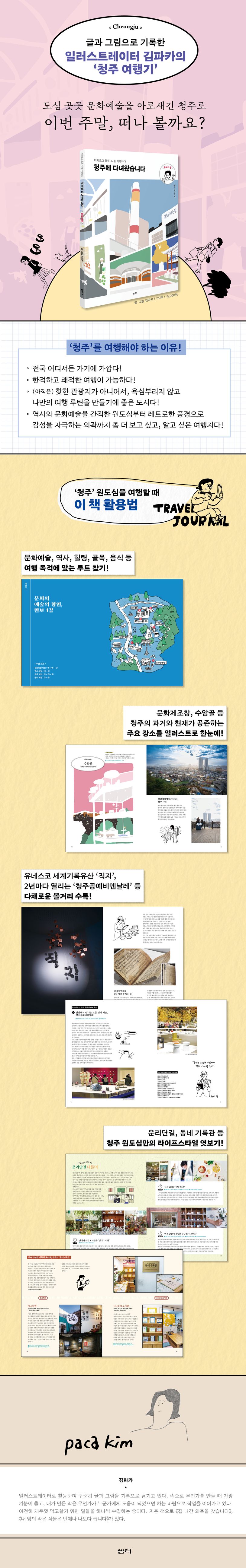 《청주에 다녀왔습니다 원도심 편》은 일러스트레이터 김파카가 자신만의 감성으로 청주를 여행하며, 청주의 잘 알려진 장소뿐만 아니라 도심과 떨어진 어느 동네의 골목 안, 발길이 닿지 않은 작은 상점까지 둘러보고, 로컬의 정겹고 생생한 모습을 글과 그림으로 기록한 책이다.