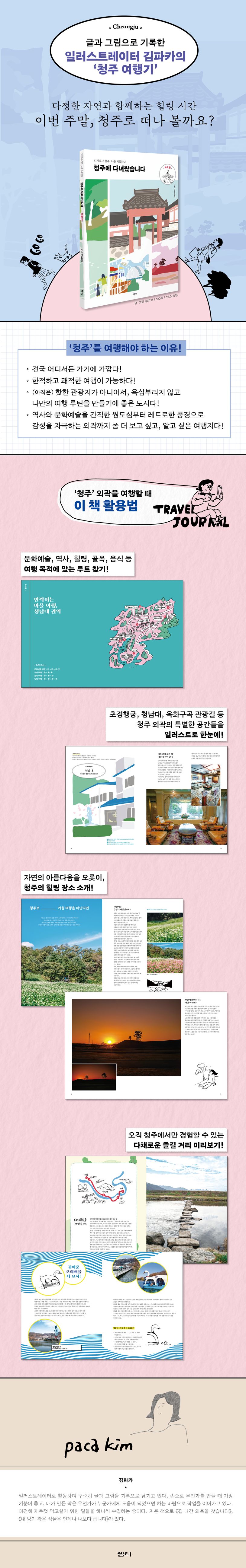 《청주에 다녀왔습니다 외곽 편》은 일러스트레이터 김파카가 자신만의 감성으로 청주를 여행하며, 청주의 잘 알려진 장소뿐만 아니라 도심과 떨어진 어느 동네의 골목 안, 발길이 닿지 않은 작은 상점까지 둘러보고, 로컬의 정겹고 생생한 모습을 글과 그림으로 기록한 책이다.