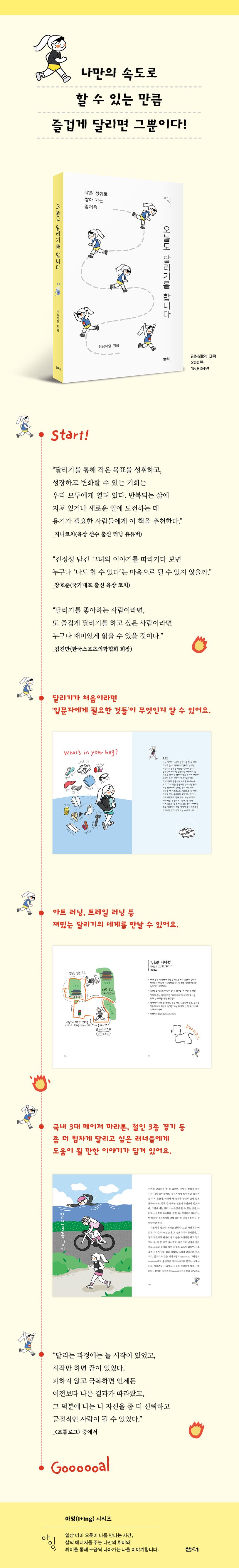 저자는 달리기가 운동화와 달리고 싶은 마음만 있다면 누구나 시작할 수 있는 운동이지만 달리기에도 기술은 필요하다며, 달리기의 시작은 어떻게 해야 하는지, 풀코스를 뛰기 전 무엇을 준비해야 하는지, 런태기가 왔을 때 어떻게 극복해야 하는지 등 달리기를 지속해 오며 부딪고 깨달은 것들에 대해 친절하게 알려 준다. 모두가 즐겁게 오래도록 달리기를 해 나갔으면 하는 마음으로 러너를 응원하는 그녀의 진심이 책 곳곳에서 느껴진다.