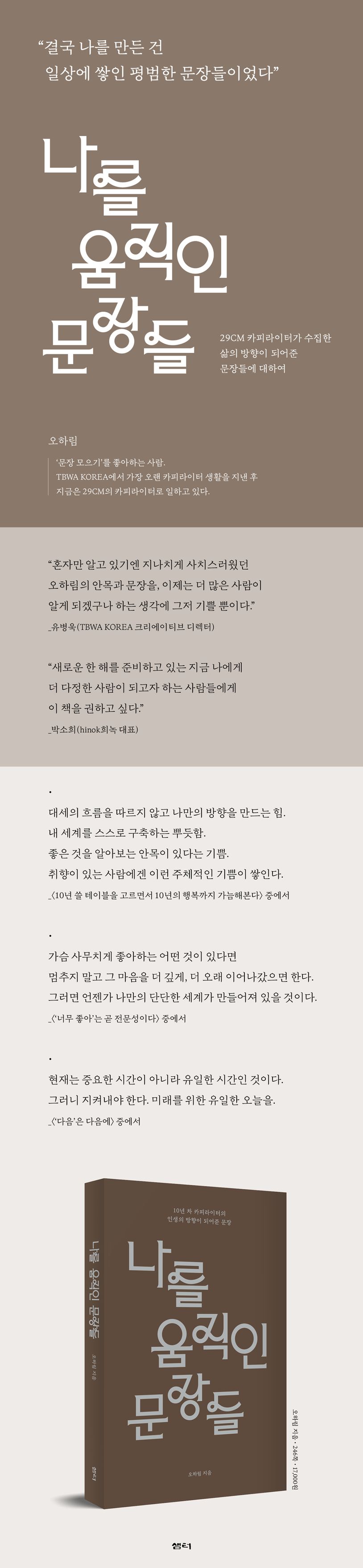 ‘문장 모으기’를 좋아하는 저자가 스무 살부터 지금까지 차곡차곡 모아온 수천 개의 문장 중 삶의 고비마다 방향을 알려주고 힘이 되어준 문장들을 모아 책으로 펴냈다. 책 속 문장들은 대단한 위인의 말이나 명언보다는 광고 카피나 책 속 한 줄, 어느 예능 프로그램의 게스트가 무심코 내뱉은 한마디, 드라마나 영화 속 대사 등 우리가 일상에서 마주한 평범한 것들이다. 그러나 저자는 익숙하고 당연해 가치를 잊어버렸던 문장들이 오히려 우리에게 울림을 준다고 말한다.