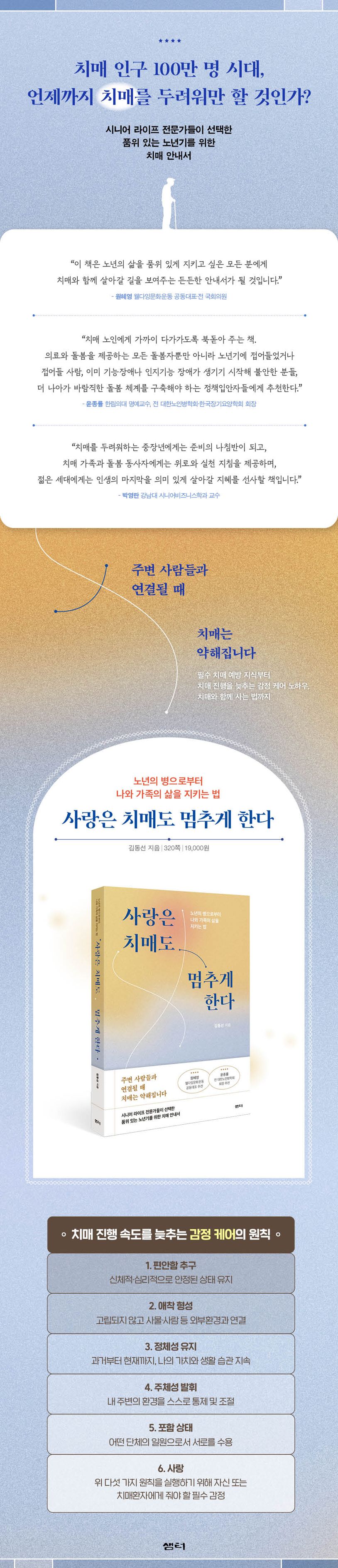 전 세계에서 가장 윤리적인 치매 케어 방법으로 알려진 사람중심케어, 국내에서 이 실천 운동을 주도하는 저자는 ‘치매 완치는 불가능해도, 치매에 걸리더라도 일상을 유지할 수 있다’라고 말한다. 현장에서 오랫동안 많은 치매환자를 지켜본 저자는 치매 초기라도 금세 중증으로 진행되는 경우와 ‘정말 치매환자 맞아?’라고 생각할 정도로 비교적 정상적으로 오래 생활하는 이들의 경우를 목격한다. 이는 치매 당사자의 증상과 감정 중 무엇에 초점을 맞추는지에 따라 달라진다. 외로움 같은 부정적인 감정을 덜어내면 증상이 그리 심하지 않은 초기 치매 상태를 최대한 오래 지속시켜 스스로의 의지대로 생활하는 것이 가능하다는 뜻이다. 저자는 이를 위해 스스로 또는 주변에서 당사자에게 사랑으로 대하는 일이 필요하다고 강조한다.