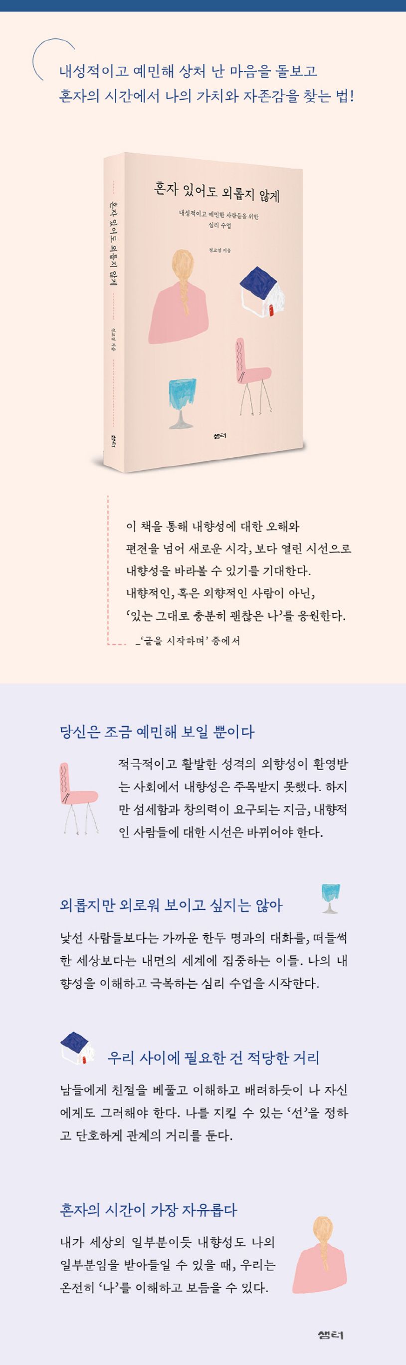 우리 사회는 외향적인 성격을 선호한다. 사람들과 원활하게 소통하고, 밝고 명랑한 사람이 사회생활을 잘한다고 믿는다. 반면에 내향적인 성격에 대해 ‘소심한, 수줍음이 많은, 예민한, 고립된, 사람들과 어울리지 못하는’ 등의 부정적인 수식어를 붙이며 이 사회에 적응하기에는 부족하고 부적절하다고 쉽게 단정한다.