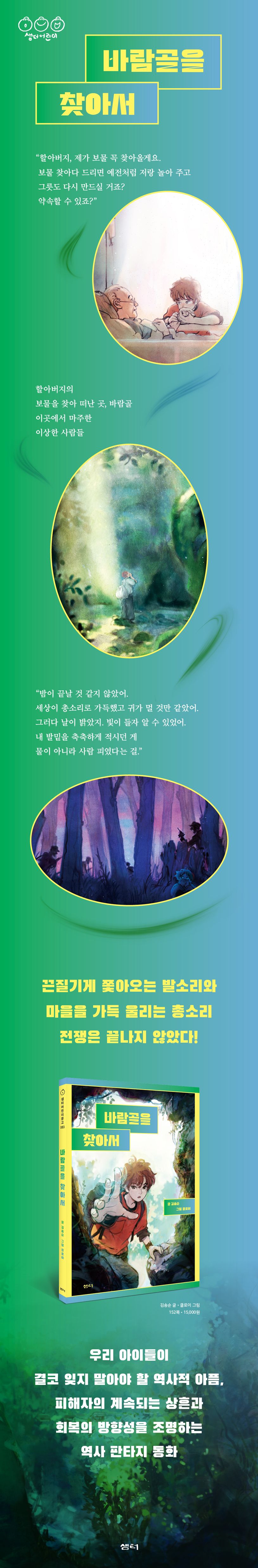 샘터어린이문고 83권. 할아버지의 보물을 찾아 나선 주인공 ‘현준’이 과거를 경험하고 돌아오면서 할아버지의 아픔을 이해하게 되는 판타지 역사 동화다. 이 이야기는 아이들이 결코 잊지 말아야 할 우리 역사의 아픔, 전쟁 피해자의 계속되는 상흔을 조명하며 회복의 방향성을 고민해 볼 수 있게 한다.