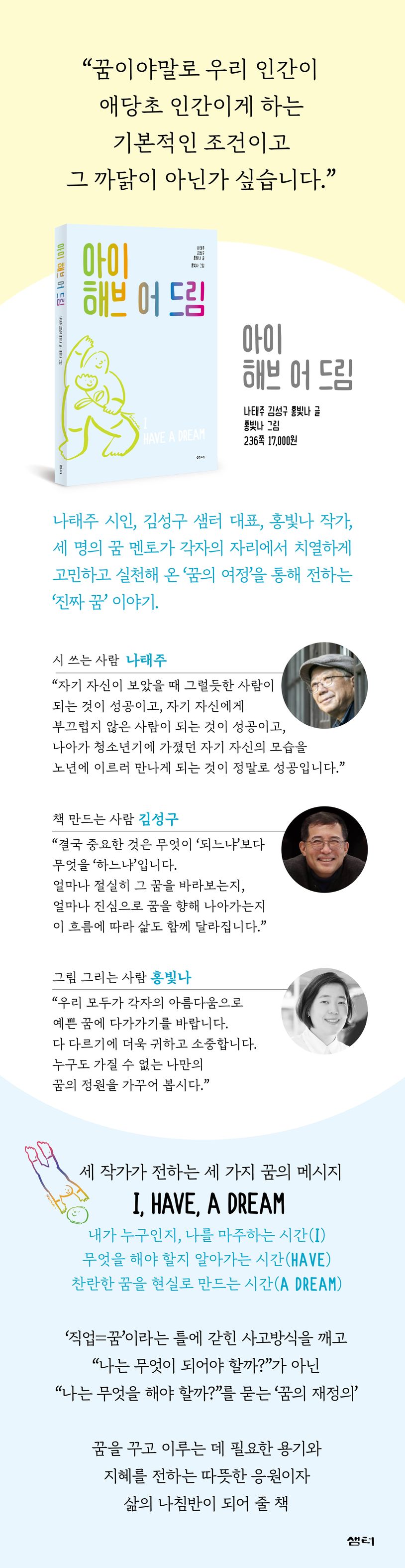 성적과 스펙, 현실의 굴레 속에서 꿈을 잃어가는 아이들에게 새로운 꿈의 방향성을 제시할 책 《아이 해브 어 드림》. 이 책은 풀꽃 시인 나태주, 55년 역사의 샘터 출판사를 이끌고 있는 김성구 대표, 그리고 감성적인 그림으로 대중과 소통하는 홍빛나 작가, 세 사람이 각자의 삶의 여정을 통해 발견한 ‘진짜 꿈’에 관한 이야기다. 오랜 시간 사회공헌 프로그램을 통해 아이들과 함께 호흡하며 그들의 성장과 꿈을 응원해 온 세 명의 ‘꿈 멘토’. 자신만의 꿈을 찾아 끈질기게 추구해 온 세 멘토의 ‘꿈의 여정’을 보여주는 이 책은 독자들이 꿈을 꾸고 이루는 데 필요한 용기와 지혜를 전하는 따뜻한 응원이자 삶의 나침반이 되어줄 것이다.