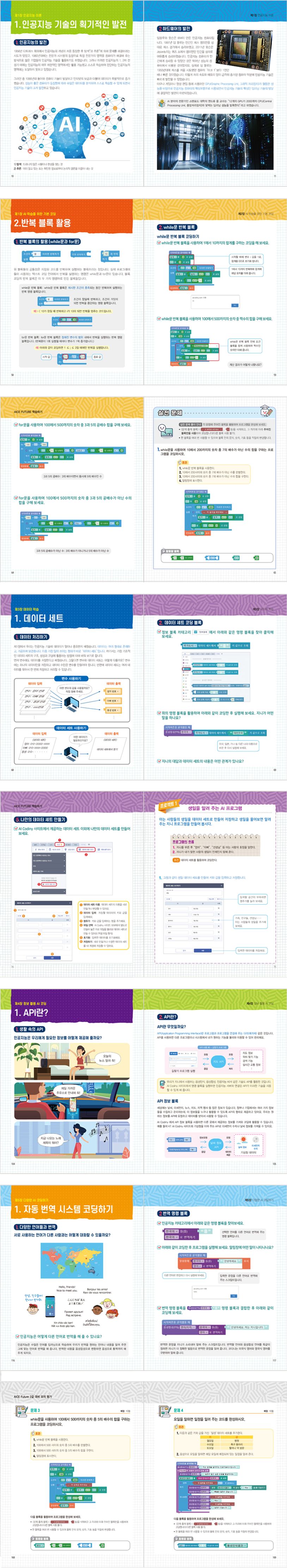 CONTENTSAICEFUTURE학습하기제1장인공지능이론1.인공지능기술의획기적인발전⑴인공지능의발전·10 ⑵하드웨어의발전·11 ⑶빅데이터의축적·122.데이터의활용⑴데이터란?·13⑵데이터의속성·14⑶데이터의수집·15⑷데이터의시각화·163.머신러닝기초⑴머신러닝이란?·18⑵머신러닝의학습방법·20⑶머신러닝의문제해결방법·224.인공지능의사회적영향⑴인공지능윤리·25⑵인공지능과우리의미래·27⑶인공지능시대의직업·28●실전문제●·29제2장AI학습을위한기본코딩1.각종코딩블록⑴이벤트코딩블록·34 ⑵흐름코딩블록·40⑶변수코딩블록·46⑷계산코딩블록·49 ⑸동작코딩블록·51●실전문제●·542.반복블록활용⑴반복블록의활용(while문과for문)·58⑵while문반복블록·59⑶for문반복블록·62 ●실전문제●·65제3장데이터학습1.데이터세트⑴데이터처리하기·68⑵데이터세트코딩블록·69⑶데이터세트를활용한코딩하기·70⑷기본데이터세트활용하기·73⑸나만의데이터세트만들기·74프로젝트1.생일을알려주는AI프로그램·75프로젝트2.물건값을알려주는AI프로그램·77●실전문제●·802.리스트⑴리스트란?·82 ⑵리스트만들기·83⑶리스트항목입력하기·84⑷리스트를활용하여코딩하기·86⑸음성으로리스트항목추가하기·88프로젝트1.코디니와함께하는여행이야기·89프로젝트2.리스트를활용하여아는사람찾아보기·913.리스트와반복문활용하기⑴반복문으로리스트항목입력하기·94⑵리스트항목합계,평균구하기·95⑶리스트항목출력하기·96 ●실전문제●·99제4장정보활용AI코딩1.API란?⑴생활속의API·104⑵API란?·1052.API를활용한코딩⑴동네별일기예보·106프로젝트1.날씨를알려주는AI프로그램·109제5장다양한AI코딩하기1.자동번역시스템코딩하기⑴다양한언어들과번역·116⑵번역명령블록·117⑶번역,통역프로그램코딩하기·118프로젝트1.자동번역AI프로그램·120 ●실전문제●·1262.영상인식과이미지인식⑴영상인식의활용·128⑵영상인식하기·129⑶이미지삽입하기·130⑷객체감지하기·131⑸객체인식활용코딩하기·132 ⑹명소감지하기·133프로젝트1.객체/명소인식스마트봇·134 ●실전문제●·1403.머신러닝기초실습⑴머신러닝이란?·142⑵지도학습과비지도학습·143⑶지도학습·144⑷비지도학습·155 ●실전문제●·159 AICEFUTURE도전하기AICEFUTURE모의평가실습방법·162AICEFUTURE2급검정실전대비가이드·163AICEFuture대비모의평가·165정답및해설AICEFuture대비실전문제정답및해설·175AICEFuture대비모의평가정답및해설·187