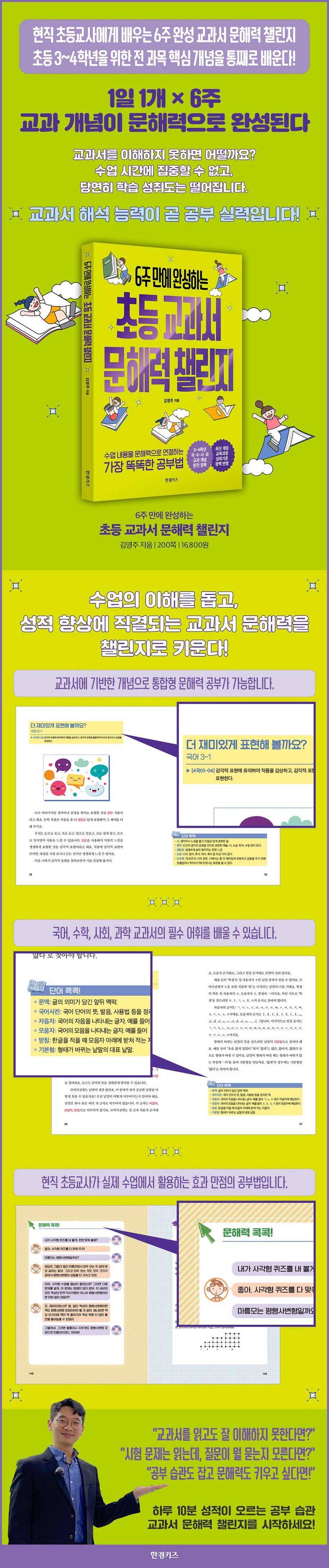 《6주 만에 완성하는 초등 교과서 문해력 챌린지》는 초등 국어·수학·사회·과학 교과서에 기반한 통합형 문해력 훈련서로, 아이 스스로 읽고, 질문하고, 생각하며 문해력을 키울 수 있도록 구성된 책입니다. 하루 10분, 한 개의 지문씩 부담 없이 실천할 수 있는 챌린지형 학습 구조로 아이의 학습 습관과 자기주도력을 동시에 키워줍니다.