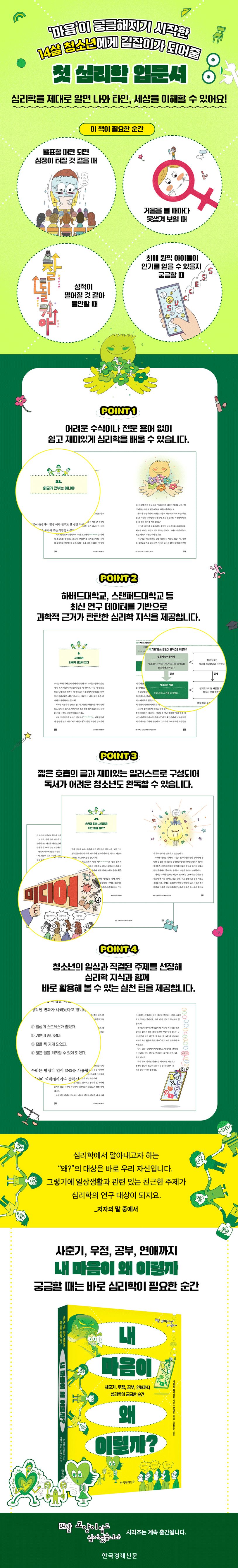 사춘기를 겪고 있다면 누구나 한 번쯤 품어봤을 법한 질문들- “연애하려면 외모가 전부일까?”, “조용한 성격은 손해일까?”, “좋아하는 일을 하면 과연 행복할까?”, “사이버 폭력을 당하면 어떻게 해야 할까?”, “인스타로 그 사람의 성공 여부를 알 수 있을까?” - 이 책은 이런 물음에 심리학의 관점에서 명쾌하고 실용적인 답을 건넨다. 읽다 보면 “심리학이 이렇게 재미있고 유용한 학문이었어?” 하는 감탄이 절로 나올 것이다.