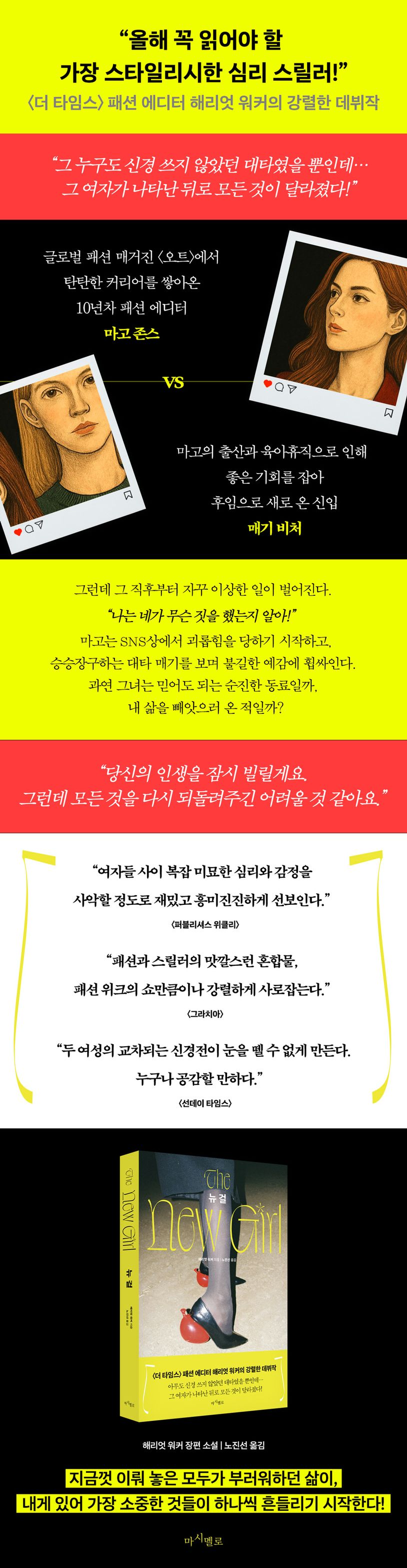 출간과 동시에 “올해 놓치지 말아야 할 스타일리시한 심리 스릴러”라는 언론과 평단의 주목을 받으며, 패션 에디터이자 저널리스트로 일해 온 저자를 대중들에게 소설가로 선명하게 각인시킨 해리엇 워커의 첫 장편소설 《뉴 걸(The New Girl)》이 출간되었다. 이 책은 저자가 직접 몸 담아온 ‘패션 업계에서 일하는 여성들의 직장 내 갈등’이라는 제한된 공간 안에서 벌어지는 현실적인 문제에 발칙하고 도발적인 상상력을 덧붙인 심리 스릴러로, 패션계라는 가장 치열하고 가십이 넘치는 곳을 배경으로 여성이라면 누구나 한번쯤 고민해봤을 결혼과 출산, 커리어를 둘러싼 크고 작은 변화와 고뇌를, 뜻밖의 등장한 복병 같은 존재 ‘뉴 걸’을 기폭제 삼아 생생하게 폭발시킨다.