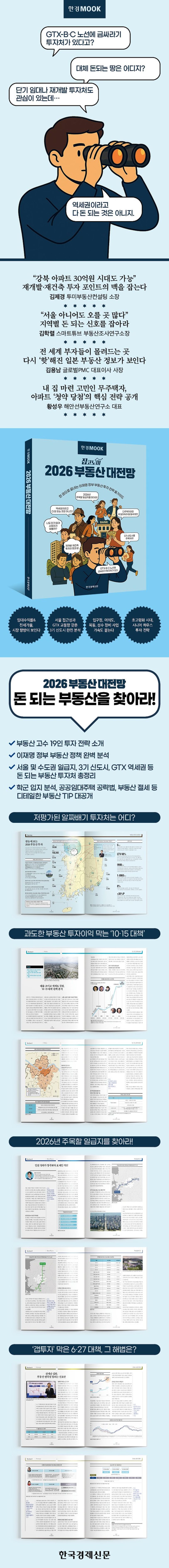 부동산 시장은 2025년 큰 격변을 맞이했다. 6·27 가계대출 관리 강화 방안, 9·7 주택공급 확대 방안, 10·15 주택시장 안정화 대책 등 이재명 정부가 짧은 기간에 부동산 정책을 연달아 내놓았기 때문이다. 정부는 부동산 시장을 안정시키기 위해, 앞으로도 새로운 부동산 정책을 쏟아낼 예정이다. 한경MOOK는 이런 상황에 생길 수 있는 부동산 시장 변수를 대비하기 위해 〈2026 부동산 대전망〉을 내놓았다. 한국경제신문 건설부동산부 기자들이 2026년 부동산 이슈와 투자처, 전략 등을 한 권에 모두 담았다.