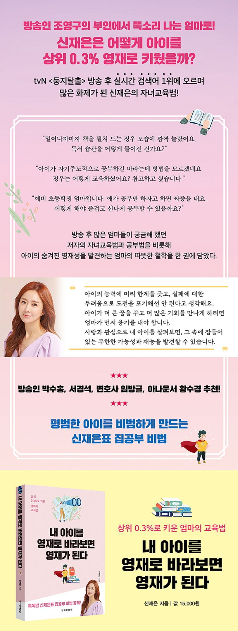 방송에서 상위 0.3%의 영재로 밝혀져 화제가 된 방송인 조영구·신재은 부부의 아들 정우. 『내 아이를 영재로 바라보면 영재가 된다』는 정우가 고려대 영재교육원에 합격하고 ‘상위 0.3% 영재’라는 타이틀을 얻게 되기까지 엄마인 신재은이 아이와 고군분투하며 찾아낸 집공부 비법과 사랑의 눈으로 아이의 숨겨진 영재성을 찾아낸 자신만의 철학을 담아낸 책이다.