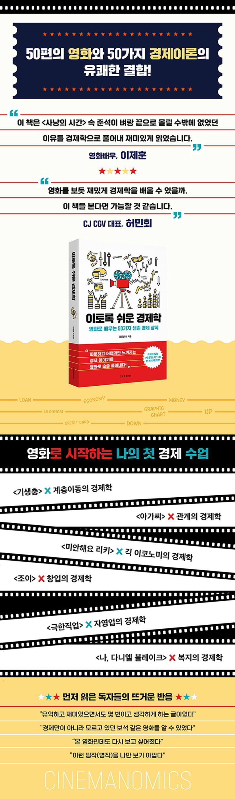 《이토록 쉬운 경제학》은 매주 토요일 〈한국경제신문〉 지면에 실렸던 ‘시네마노믹스’ 코너의 글들을 한 권의 책으로 묶은 것이다. 세계적으로 인기를 끈 대작부터 잘 알려지지 않은 독립영화까지 다양한 작품 50편을 아울렀다.