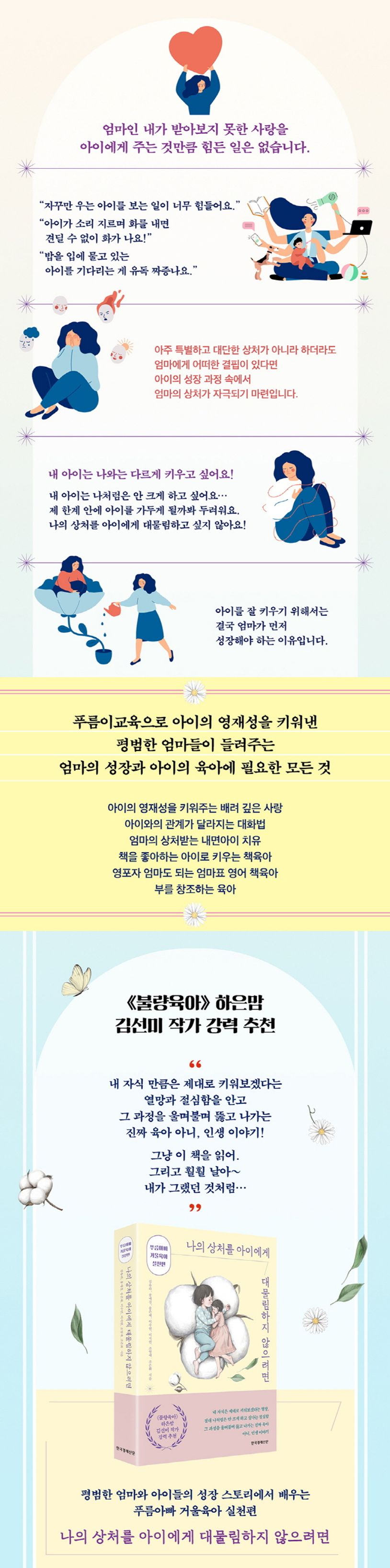 지난 23년 동안 한국뿐만 아니라 중국, 일본 등 여러 나라에서 갓 태어나서부터 성인이 될 때까지 푸름이교육으로 양육된 수많은 아이들은 뛰어난 학업 성취는 물론, 스스로 자신의 재능을 발견하여 이를 개발하고 활용할 줄 아는 자존감 높은 아이들로 자라났다. 더불어 사회적으로 큰 성공을 이뤄내며 스스로가 장엄하고 고귀한 존재라는 것을 아는 사람으로 성장했다. 그 과정에서 아이와 함께 자란 엄마들은 어떻게 되었을까? 《나의 상처를 아이에게 대물림하지 않으려면》 이 책은 아이를 나보다는 행복하게 키우고 싶었던 엄마들의 열심과 분투 안에서, 아이는 행복하게 자라고 엄마는 스스로에 대해 알아가고 성장하는 여정을 진솔하게 들려준다. 그 여정을 통해서 독자들은 고단한 육아 속에서 아이를 키우는 일이 무엇보다 보람된 일임을, 사랑하는 내 아이는 자기만의 중심을 갖고 단단하고 지혜롭게 키우는 방법을 배울 수 있다.