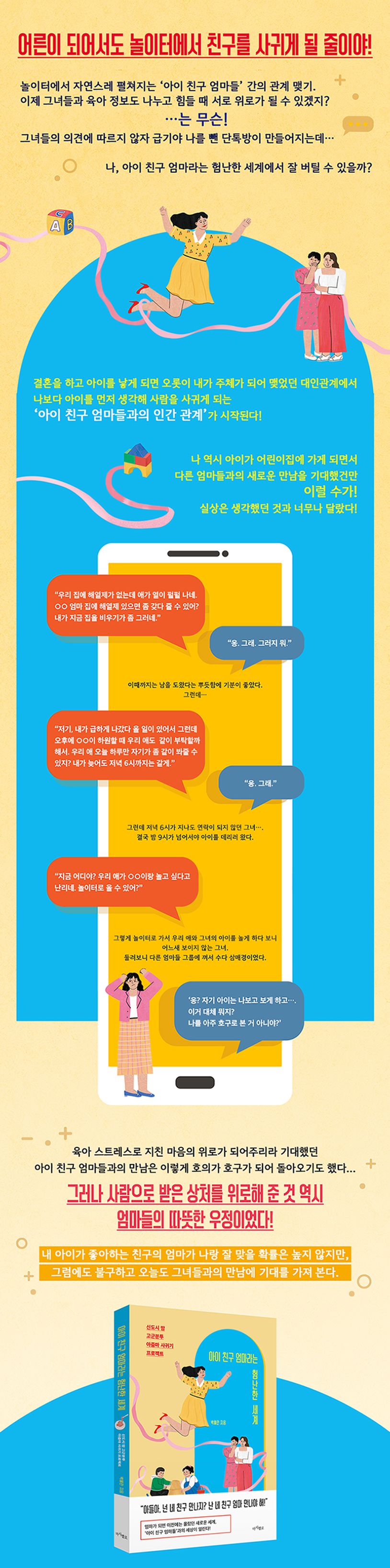 하지만 엄마들과의 관계에서 안 좋은 일들만 있었던 것은 아니다. 고민이 있을 때 털어놓으면 서로의 이야기를 잘 들어주며 힘이 될 수 있는 일은 도와주려 하고, 힘들다고 하면 서로를 안아주려고 하는 따뜻한 모습에 다시금 마음을 다잡았다. 사람에게 받은 상처를 위로해준 것 역시 사람이었던 것이다. 이 책에서는 결혼 후 처음 마주하게 되는 ‘아이 친구 엄마라는 험난한 세계’에서 저자가 겪은 다양한 에피소드를 통해 여성 그리고 엄마로서의 삶, 진정한 친구란 무엇인지에 대한 생각들을 공유한다.