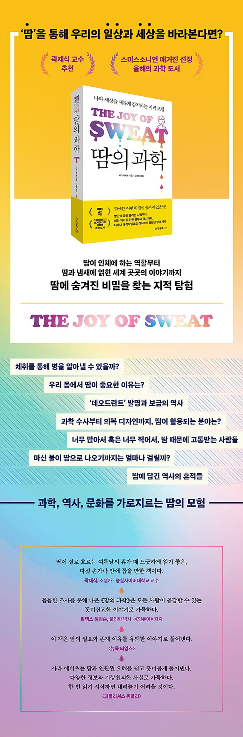 이처럼 《땀의 과학》은 과학적 접근을 시작으로 역사와 문화와 산업을 넘나들며 우리를 ‘땀의 세계’로 안내한다. 과학적 지식과 정보를 쉽게 풀어내서, 과학에 대한 두려움을 갖고 있는 사람도 부담 없이 읽을 수 있다. 탄탄한 취재와 조사를 기반으로 한 생생한 서술도 돋보인다. 해외에서는 〈뉴욕 타임스〉, 〈네이처〉 등 유수의 매체로부터 추천을 받았다. 〈스미소니언〉 매거진 선정 ‘올해의 과학 도서’(2021년)이기도 하다.