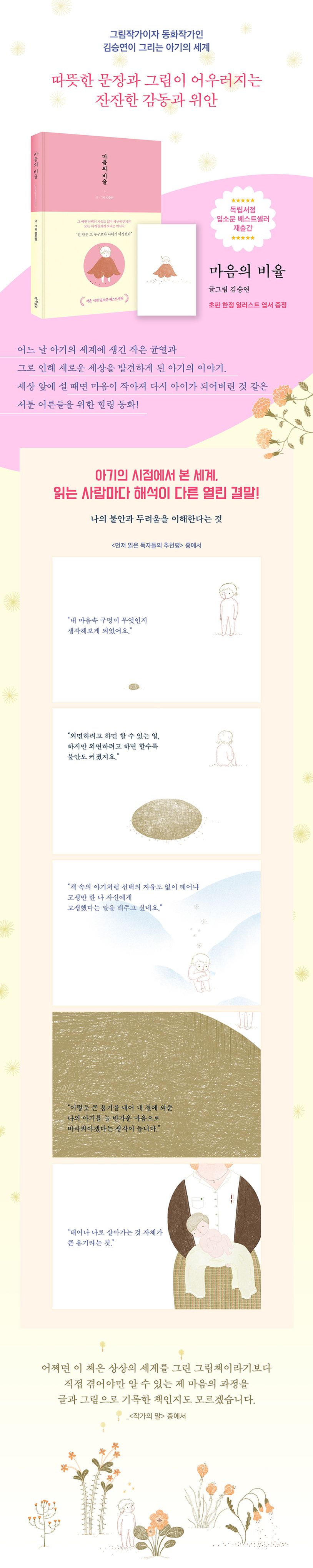 아기는 시간이 흘러 어른이 되었다. 하지만 여전히 나를 마주하는 것은 어렵기만 하고, 세상 앞에 설 때마다 마음은 작아져 다시 어린아이가 되어버린 것만 같다. 새로운 곳에 가거나 낯선 환경에 놓일 때, 때로 세상 앞에 작아질 때……때로 여러 마디의 미사여구보다 소박한 말 한마디에 큰 힘을 얻어가는 것처럼, 이 책《마음의 비율》이 주는 울림은 어느 때보다 크게 다가온다.