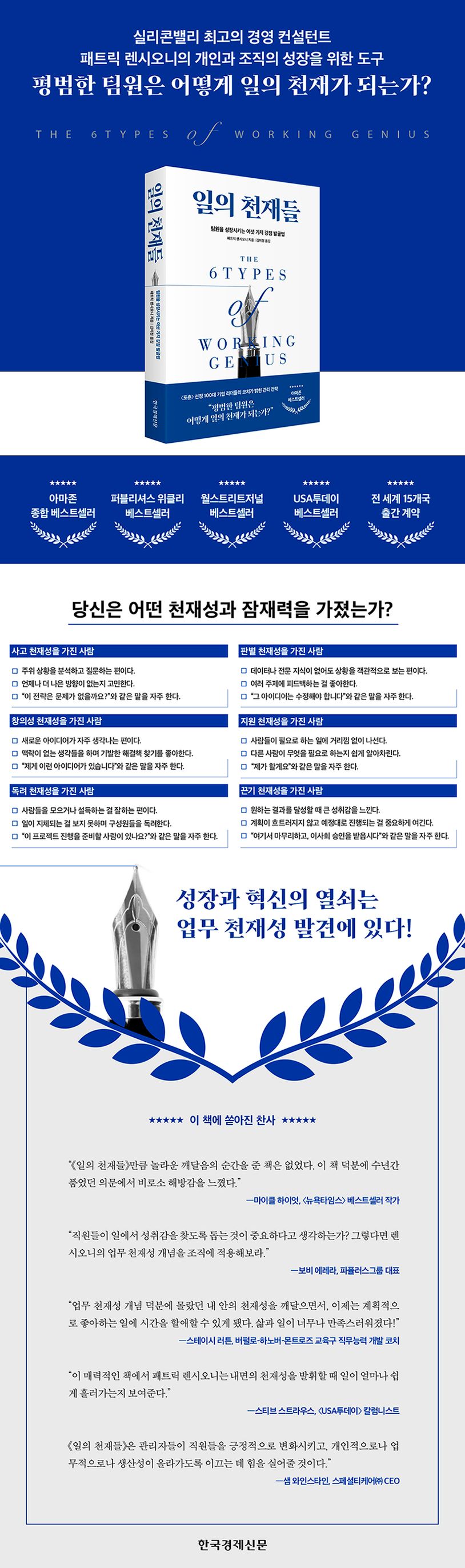 실무자, 관리자, 경영자. 조직 내 역할과 지위의 차이를 떠나 많은 이들이 일을 하면서 기쁨보다는 좌절을 더 자주 겪기 마련이다. 저성과, 저성장, 번아웃, 무기력 등 일과 관련된 문제들의 해결책은 어디에서 찾을 수 있을까? 실리콘밸리 최고의 경영 컨설턴트 패트릭 렌시오니는 〈포춘〉 선정 100대 기업을 포함하여 스포츠팀, 군대, 비영리 단체, 대학, 교회 등 다양한 조직을 컨설팅했다. 그리고 팀워크와 조직 성장에 대한 오랜 연구 끝에 일에서 생기는 많은 문제의 해결책은 바로 개인의 잠재성 발굴에 있다고 보았다. 사람들이 일 때문에 스트레스를 받고 성과가 낮은 것은 “일이 많아서가 아니라 적합하지 않는 일만 하기 때문”이라고 강조하며, 개인의 강점과 적성을 진단하는 ‘업무 천재성’ 테스트를 개발했다. 그리고 천재성 유형과 활용법을 이 책, 《일의 천재들》에 담았다.