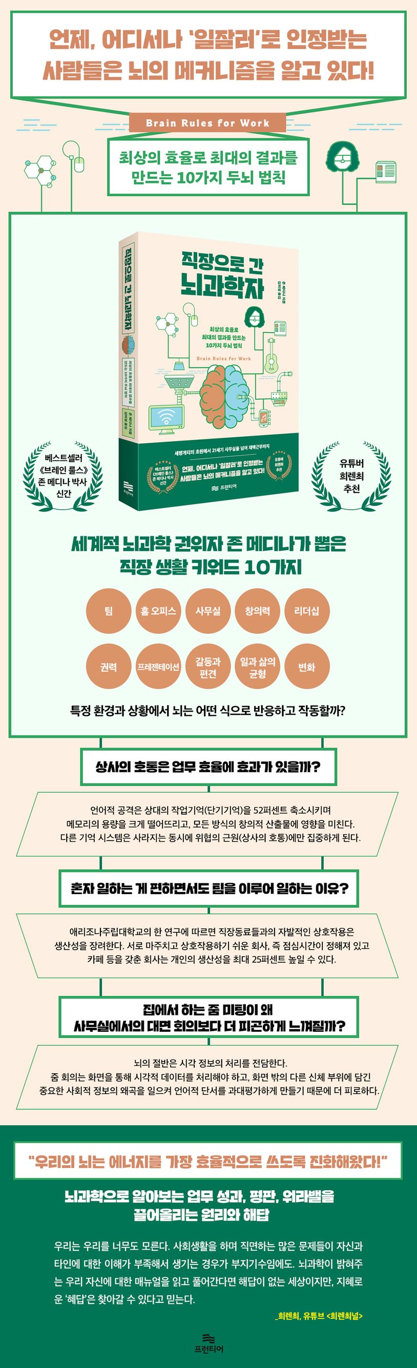 하지만 뇌는 때때로 현대 생활에 기꺼이 순응하기도 하는데, 뇌의 내부 메커니즘을 충분히 알고 뇌의 자연적 경향에 반하기보다 맞춰 일할 때 그렇다. 뇌과학의 세계적 권위자인 존 메디나 박사는 이 책에서 뇌과학과 진화생물학을 바탕으로 현대와 코로나19 이후 더 다변화된 업무 방식과 환경에서 두뇌가 작동하는 방식에 대한 이해를 통해 그 기능성을 더 잘 발휘하도록 하는 방법을 제안한다.