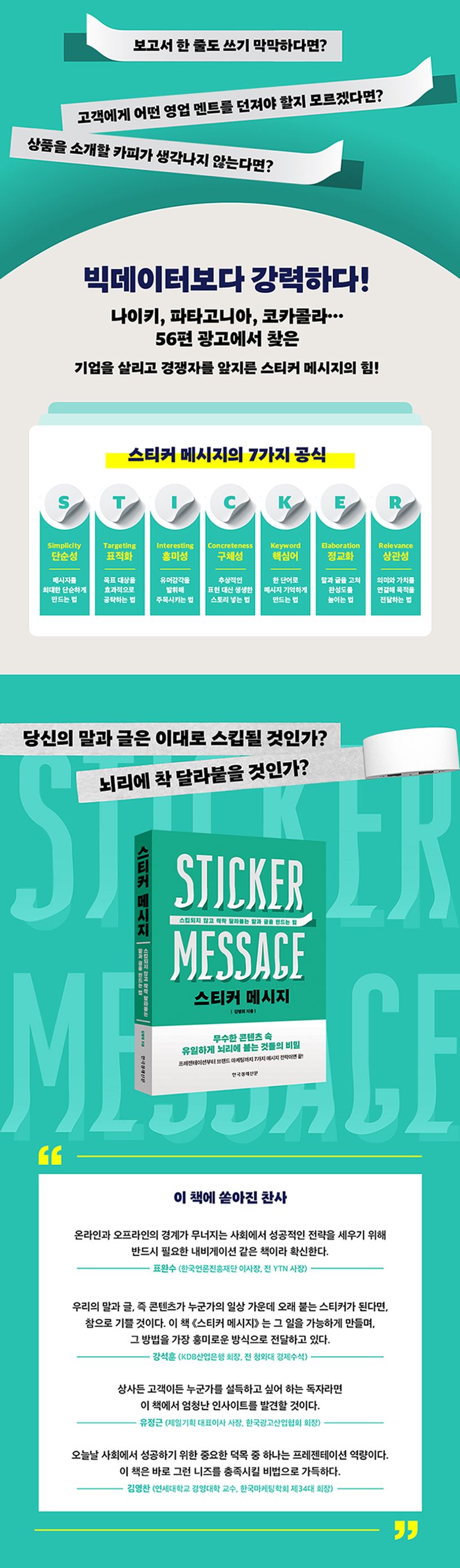 비대면 업무가 늘어나면서 보고서나 메일을 쓸 일은 더 많아졌다. 게다가 제품과 브랜드를 홍보할 때도 SNS에 올릴 카드뉴스, 홍보 카피 한 줄까지 메시지 전달이 너무나 중요하지만 스킵(skip)되기 일쑤다. 프레젠테이션을 하거나 대면 영업을 할 때도 사람들의 주목을 받고 설득하기가 쉽지 않다. 어떻게 내 메시지를 제대로 전달할 수 있을까? 이 책 《스티커 메시지》는 주목받기 어려운 때 우리의 메시지가 1초 만에 스티커처럼 착 달라붙어 상대의 마음을 사로잡는 법을 이야기한다.