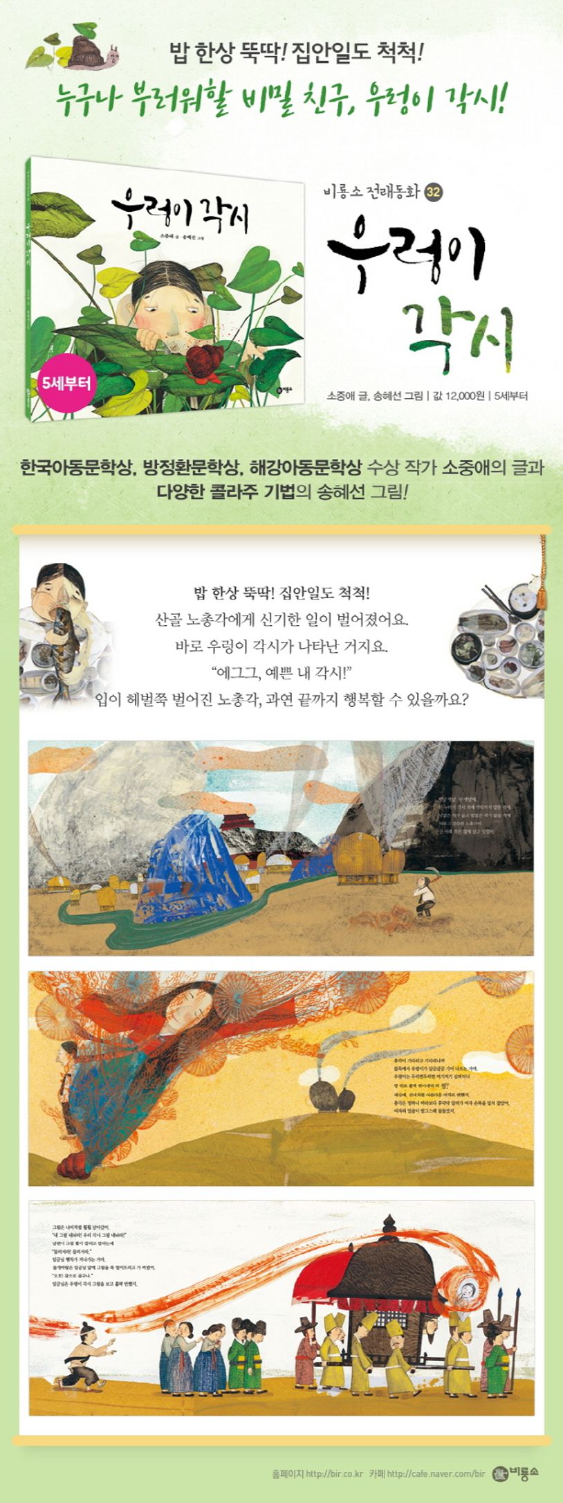 비룡소 전래동화 제32권 『우렁이 각시』. 산골 노총각 앞에 어느 날 갑자기 나타난 우렁이. 이 우렁이를 집으로 데리고 온 후 총각의 삶은 즐겁고도 행복하게 바뀐다. 늘 혼자여서 웃을 일 없던 산골 마을 가난한 집에 신비롭고 비밀스러운 친구가 생겼기 때문이다. 눈만 뜨면 밥 한상 뚝딱! 집 안도 말끔하게 정리되어 있어 있으니 얼마나 놀랍고 좋았을까. 총각은 숨어 우렁이를 지켜보다 색시로 변하는 걸 목격하고 바로 결혼하자고 한다. 이렇게 부부가 되어 깨가 쏟아지듯 사는 것도 잠시, 우연히 우렁이 색시를 보고 반한 임금이 방해를 한다. 온갖 내기를 해 우렁이 색시를 빼앗을 궁리를 하기 때문이다. 하지만 총각을 든든히 지켜 주고자 했던 우렁이 각시는 영험한 힘을 발휘해 모든 내기에서 이기고 심지어 못된 왕 대신 왕과 왕비가 되어 오래도록 행복하게 산다.