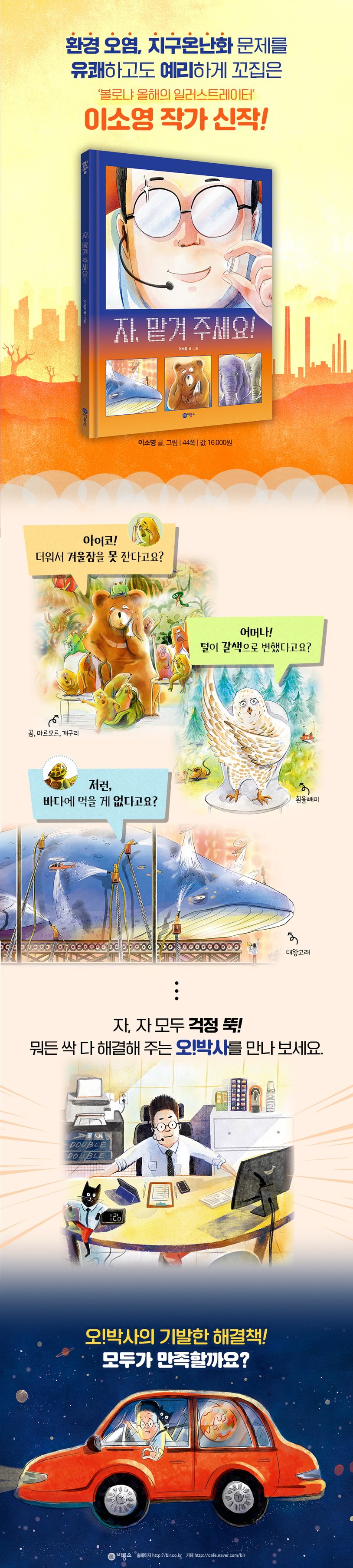 한국과 프랑스에서 그림책 작가로 활발하게 활동하고 있는 이소영 작가의 신작이 출간되었다. 세련된 색감에 풍부한 표정의 캐릭터들이 유쾌하게 펼치는 이야기 속에는 뼈 깊은 메시지가 숨어 있다. 모든 걸 편리하고 빠르게만 맞춘 시스템들이 얼마나 위험한지, 결국 지구와 모든 생명체들에게 어떠한 영향을 미치는지 우회적으로 보여 준다. 제목부터가 반전인 이 그림책이 던지는 환경 오염, 지구온난화, 더불어 사는 것에 중요함 등의 다양한 메시지를 아이들과 함께 읽고 이야기하면서 환경 문제에 대해 깊이 생각을 나눌 수 있다