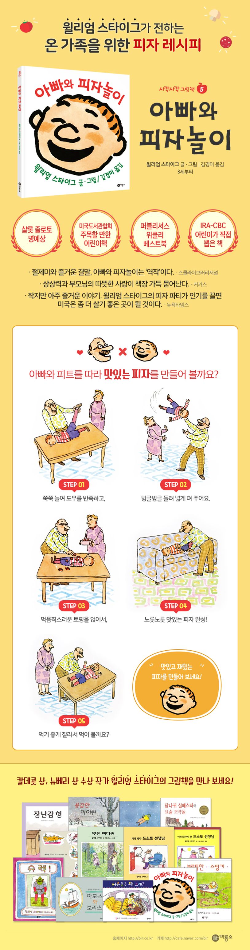 갑자기 쏟아지는 비 때문에 밖에 나가 놀지 못해 속상한 피트, 이를 본 아빠는 아들의 기분을 풀어 주기 위해 피트를 피자로 만들기로 한다. 도우를 반죽하듯 피트의 몸을 주무르고, 피자 만들기에 필요한 오일은 물로, 밀가루는 베이비파우더로, 토핑은 게임 칩과 종잇조각으로 대신하니 어느새 노릇노릇 맛있는 피트 피자가 완성된다. 윌리엄 스타이그는 막내딸이 어린 시절에 함께 했던 놀이를 떠올려 이 이야기를 만들었다. 경험에서 우러난 이야기는 보는 이의 공감을 불러일으키며, 아빠와 함께하는 피자놀이의 주인공이 된 것처럼 몰입하게 된다. 각각의 과정도 피자 요리의 레시피처럼 간결하고 명확한 지시어로 되어 있어 쉽게 따라 해 볼 수 있다.