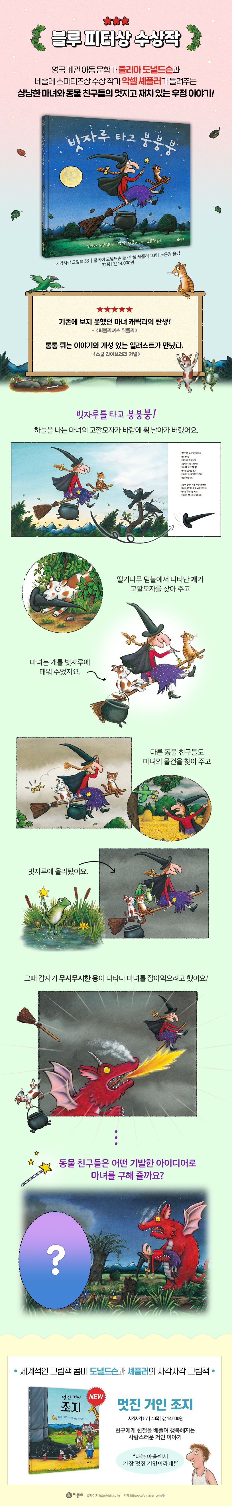 『빗자루 타고 붕붕붕』 역시 블루 피터상을 수상하였고, 연극과 애니메이션 영화, 게임으로도 제작되었다. 특히 애니메이션은 많은 아이들의 사랑을 받아 인터내셔널 키즈 에미상을 수상했으며, 오스카상 후보에 오르기도 했다. 말썽을 피울 것 같은 기존의 마녀 이미지에서 벗어나 상냥한 마녀와 동물 친구들의 우정 이야기를 그려낸 그림책이다.